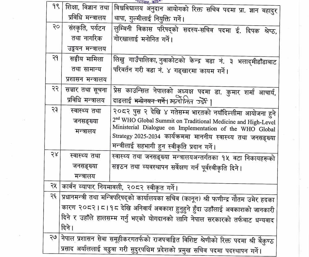 त्यस्तै सरकारले प्रेस काउन्सिल नेपालको अध्यक्ष कुमार शर्मा आचार्यलाई मनोनित गर्ने निर्णय गरेको छ । त्यसैगरी बैठकले आगामी माघ १ गतेदेखि एक पटकमा पाँच लाख रुपैयाँ वा सो भन्दा माथिको सेवा, बस्तुको खरिद बिक्री वा अन्य कारोबार गर्दा वित्तीय संस्था वा बैङ्किङ उपकरणबाट गर्नुपर्नेगरि नगद कारोबारको सीमा निर्धारण गर्ने निर्णय गरेको छ ।