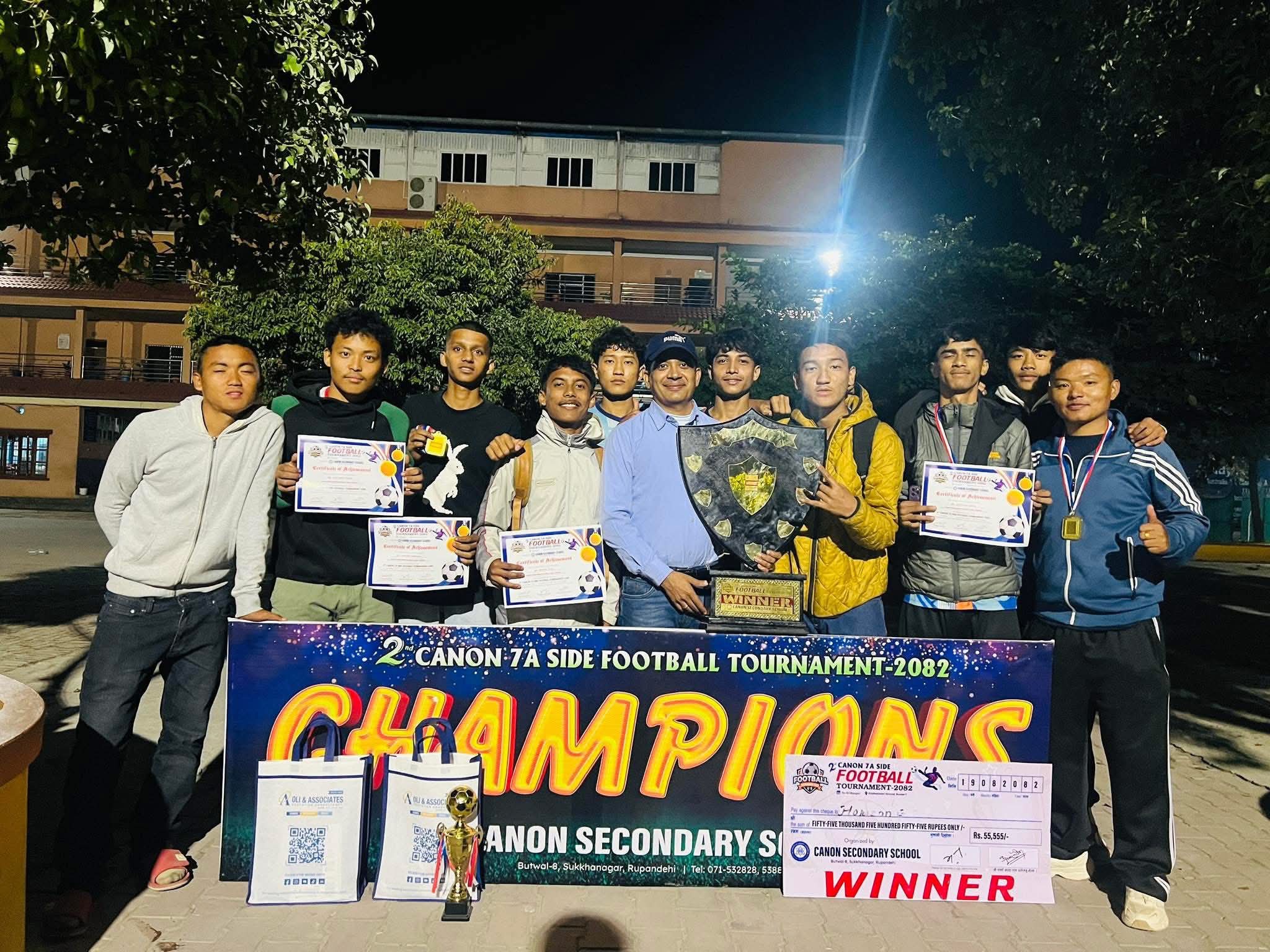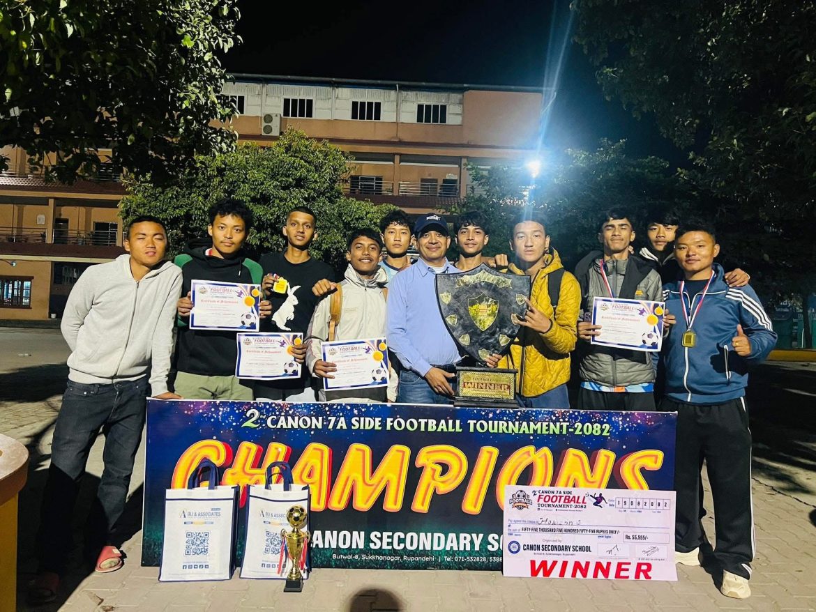 बुटवल।बुटवलमा सम्पन्न दोस्रो क्यानन सेभेन ए साइड फुटबल प्रतियोगिता–२०८२ को उपाधि होराइजन जिबिएसले जितेको छ। क्यानन मावि बुटवल सुख्खानगरको आयोजनामा शुक्रबार भएको फाइनल खेलमा जिबिएसले रोमाञ्चक जित निकाल्दै ट्रफी आफ्नो पक्षमा पारेको हो।