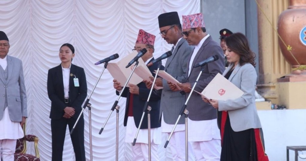 काठमाडौँ।राष्ट्रपति कार्यालय शीतल निवासमा नवनियुक्त चार जना मन्त्रीहरूले पद तथा गोपनीयताको शपथ ग्रहण गरेका छन् ।