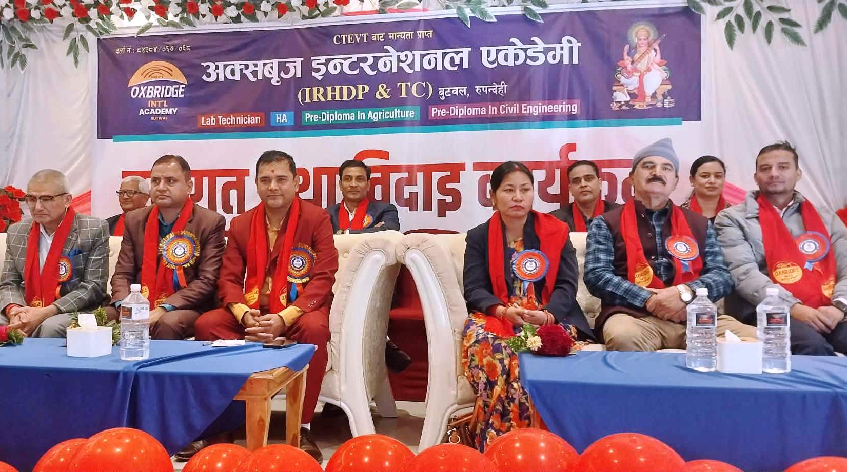 कार्यक्रममा भिम अस्पताल भैरहवाका अध्यक्ष आनन्दप्रसाद शर्मा, सिटिईभिटीका लुम्बिनी प्रदेशका वरिष्ठ अधिकृत राजु भुसाल, फोरम फर हेल्थ साइन्सका केन्द्रीय सल्लाहकार चिरञ्जीवी जोशी, फोरम फर हेल्थका प्रदेश सचिव विनोद घिमिरे, अक्सबृजका भिजिटर लेक्चर मधुकर शर्मा, पत्रकार कपिल ज्ञवाली लगायतले उच्च शिक्षा अध्ययनका लागि विदाई पाएका विद्यार्थीलाई शैक्षिक सफलताको शुभकामना व्यक्त गर्नुभयो।