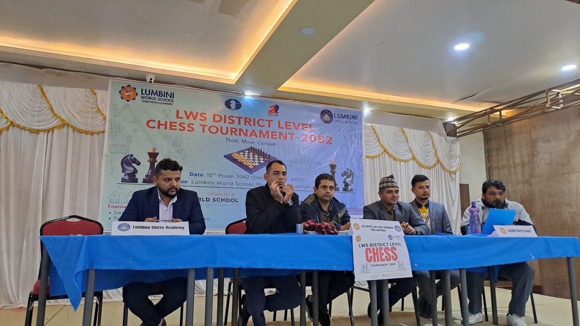 बुटवल । रूपन्देहीको तिलोत्तमा नगरपालिका–१३ मधवलियास्थित लुम्बिनी वल्र्ड स्कूलमा जिल्ला स्तरीय ‘एलडब्लूएस् चेस प्रतियोगिता–२०८२’ हुने भएको छ । लुम्बिनी चेस एकेडेमीसँगको सहकार्यमा यहि पुस १५ गते प्रतियोगिता आयोजना गर्न लागिएको मंगलबार पत्रकार सम्मेलन गरि जानकारी गराइएको हो ।
