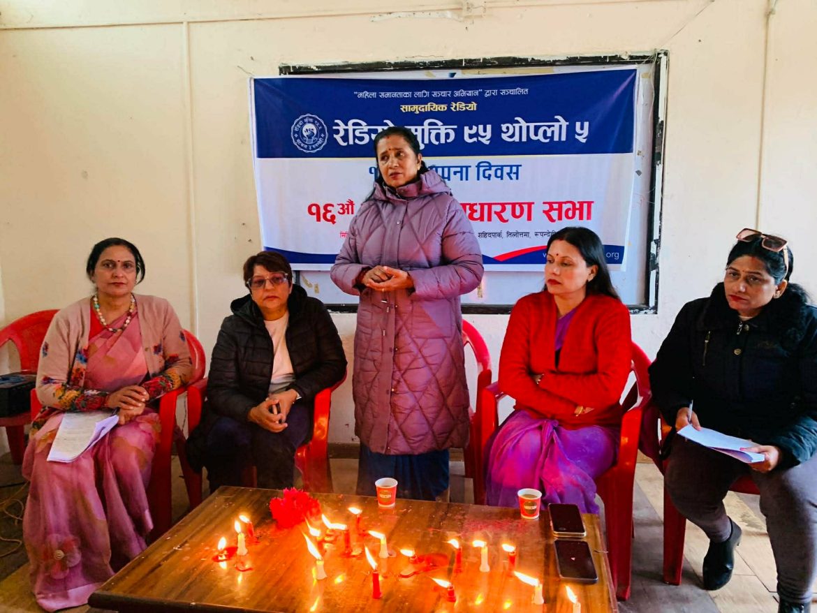बुटवल । महिला समानताका लागी संचार अभियानद्धारा संचालित सामुदायिक रेडियो मुक्ति ९५.५ को १८ औ स्थापना दिवस तथा १६ बार्षिक साधरण सभा बुधबार शंकरनगर वनवाटिका तिलोत्तमामा सम्पन्न भएको छ । कार्यक्रममा बोल्दै प्रमुख अतिथि बुटवल उपमहानगरपालिकाका उपप्रमुख साबित्रादेवि अर्यालले संचारमाध्यमले सत्य तथ्य समाचार संपे्रषण गर्नुपर्ने बताउनुभएको छ । ]