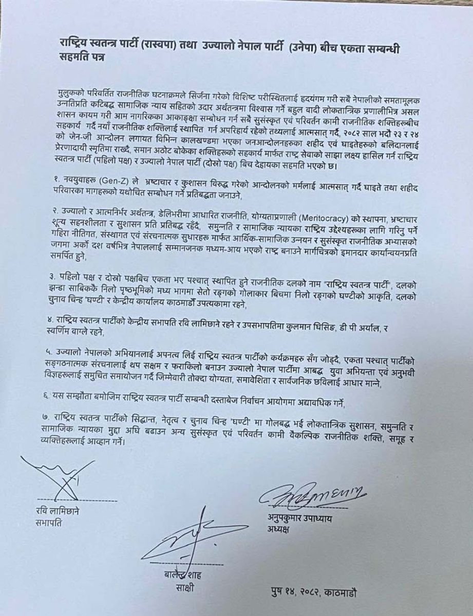 राष्ट्रिय स्वतन्त्र पार्टी (रास्वपा) तथा उज्यालो नेपाल पार्टी (उनेपा) बीच एकता सम्बन्धी सहमति पत्र