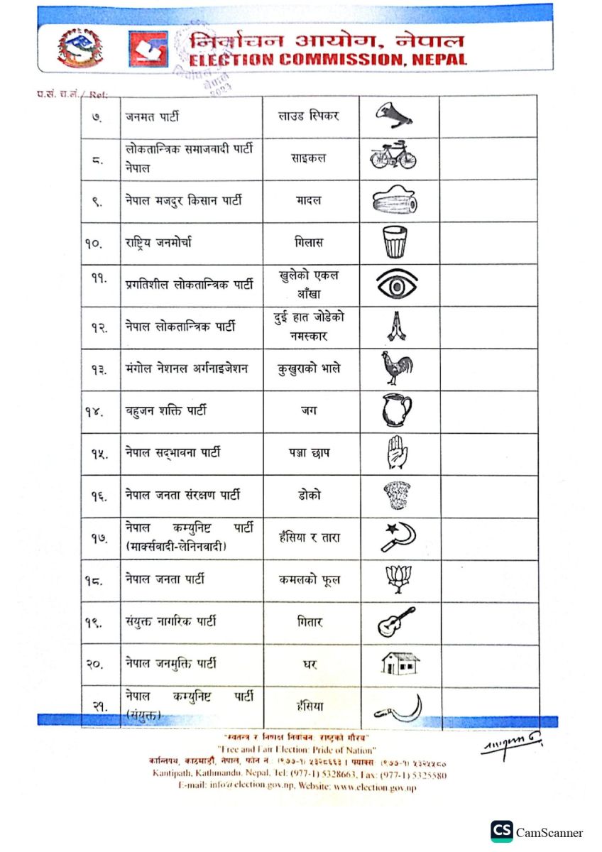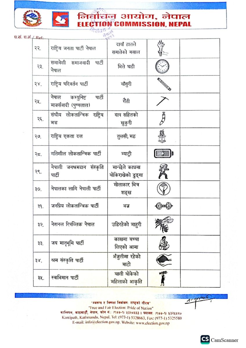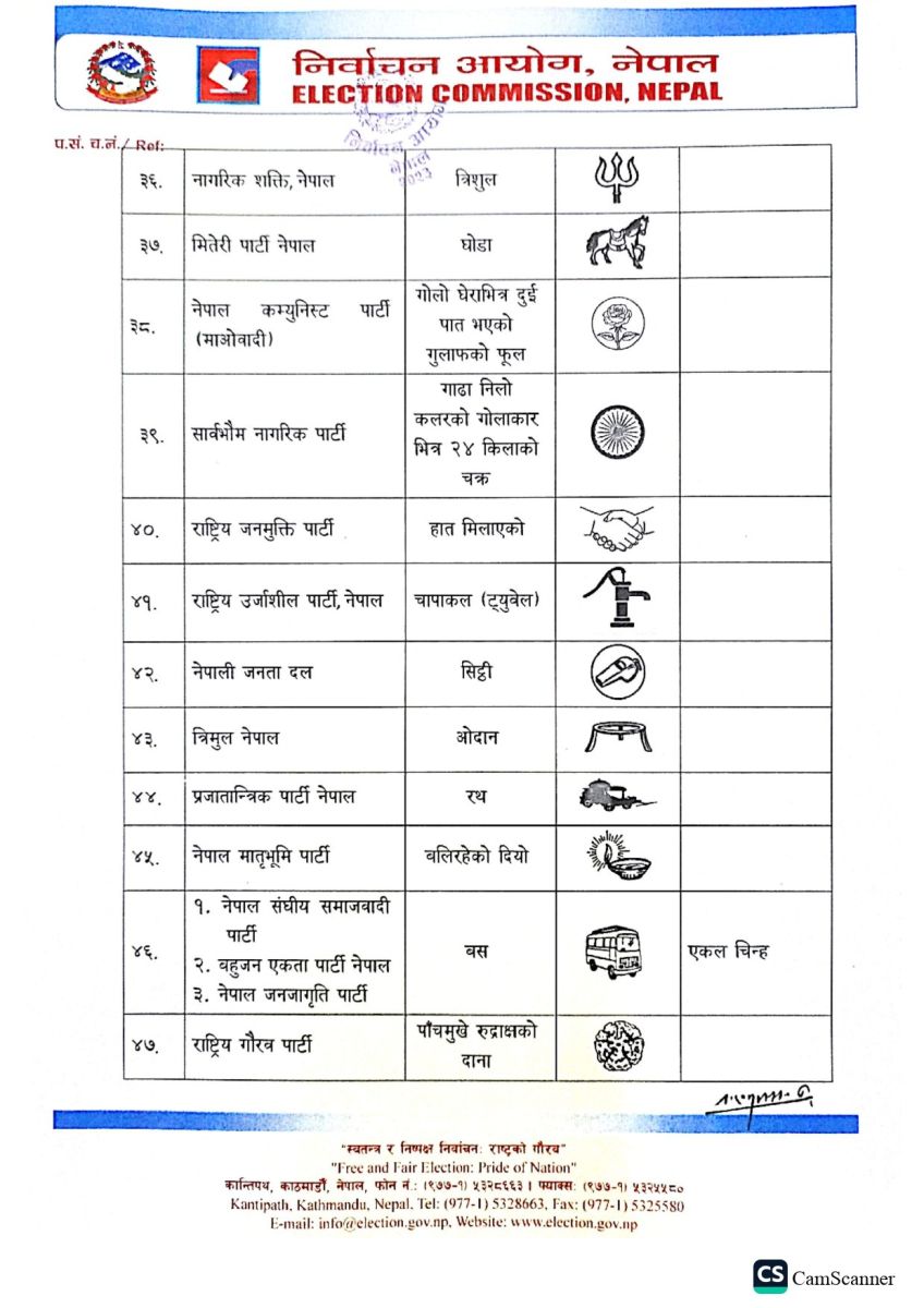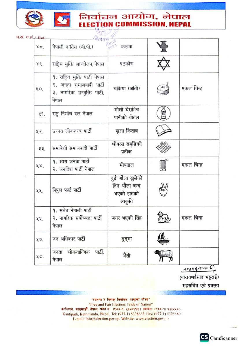 ती दलहरूले ५८ वटा चुनाव चिह्नबाट चुनाव लड्ने गरी बन्दसूची पेस गरेको निर्वाचन आयोगका प्रवक्ता नारायणप्रसाद भट्टराईले जानकारी दिए । निर्वाचन आयोगले निर्धारण गरेको निर्वाचन कार्यक्रम अनुसार पुस १३ र १४ गते बन्दसूची पेस गर्ने कार्यतालिका तोकेको थियो ।
