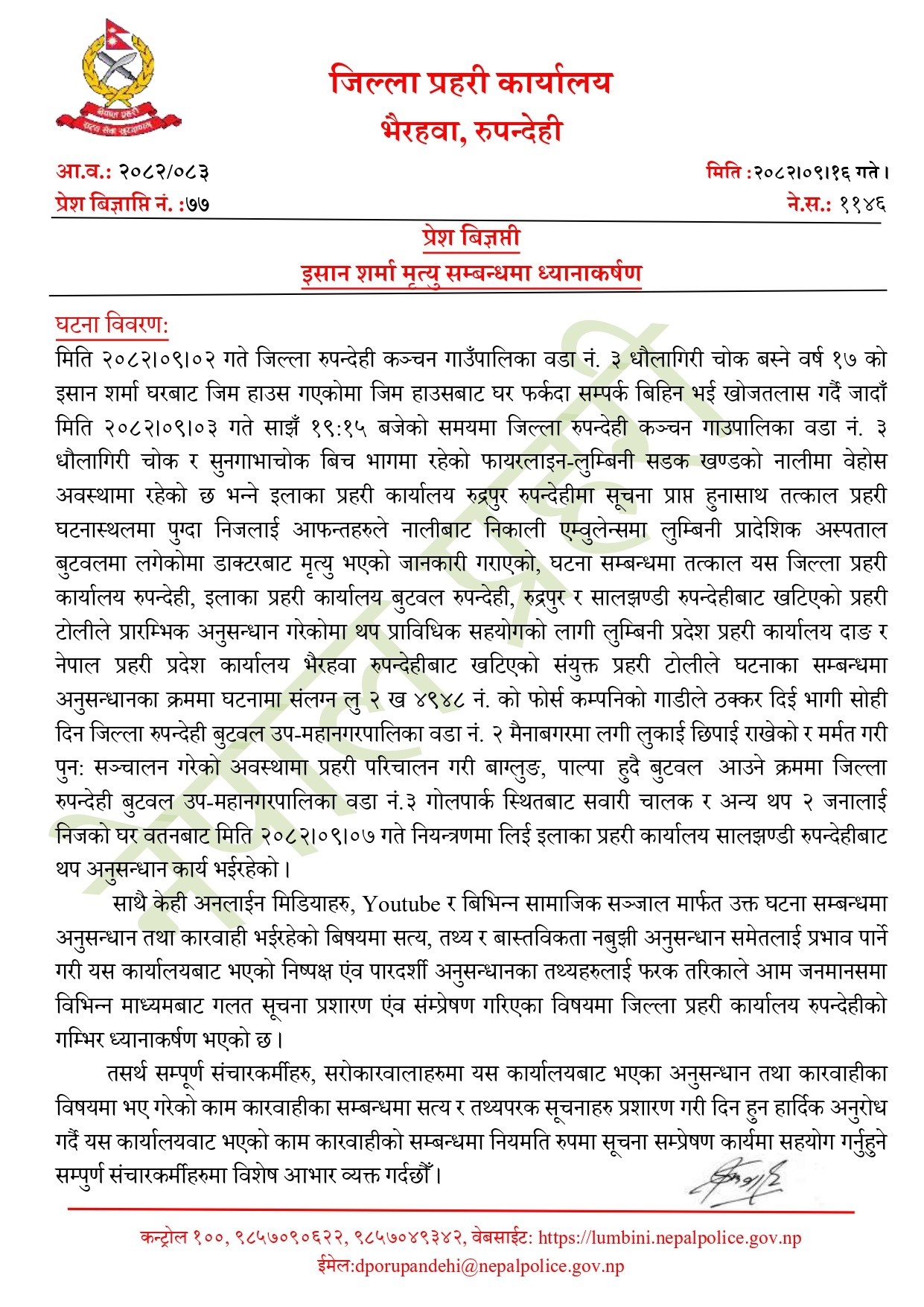 बुटवल । रुपन्देही कञ्चनका इसान शर्माको मृत्यु प्रकरणमा अपवाह फैलिएको भन्दै नेपाल प्रहरीले गम्भीर ध्यानाकर्षण भएको जनाएको छ। जिल्ला प्रहरी कार्यालय रुपन्देहीले प्रेस विज्ञप्ति जारी गर्दै हालसम्मको अनुसन्धानबाट उक्त घटना हत्या नभएको स्पष्ट पारेको छ।