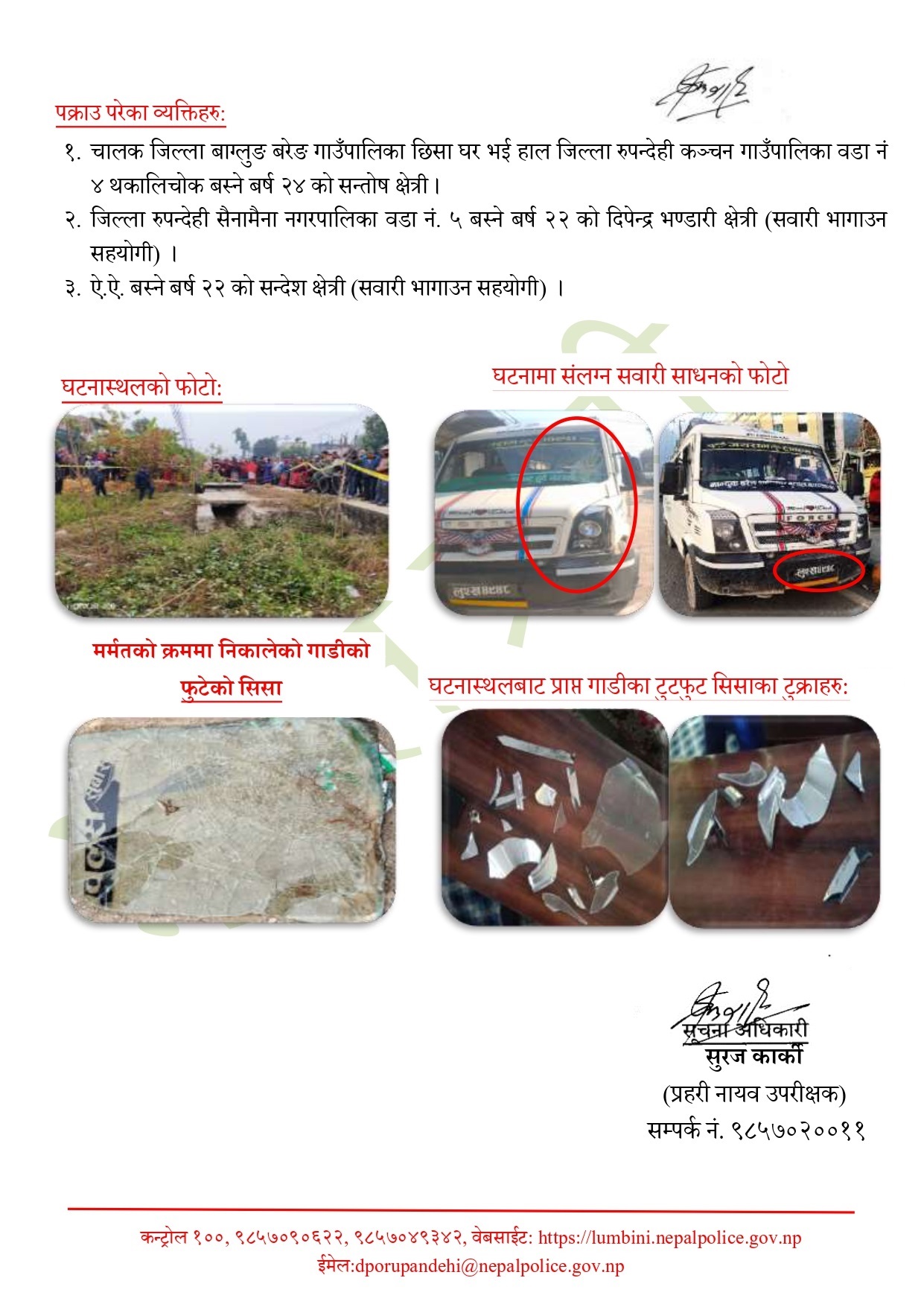 प्रहरीले ठक्कर दिने गाडी चालक बागलुङ बरेङ गाउँपालिका–छिसा घर भई हाल रुपन्देही कञ्चन गाउँपालिका–४ थकालीचोक बस्ने सन्तोष क्षेत्रीलाई नियन्त्रणमा लिएको छ। साथै सवारी भगाउन सहयोग गरेको आरोपमा रुपन्देही सैनामैना नगरपालिका–५ बस्ने दिपेन्द्र भण्डारी क्षेत्री र सोही स्थानका सन्देश क्षेत्रीलाई पनि पक्राउ गरी अनुसन्धान भइरहेको जनाएको छ।