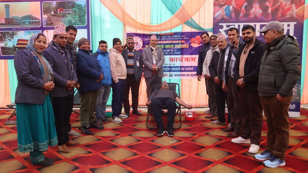 बुटवल। पर्यटन प्रवद्र्धन गर्ने उदेश्यका साथ बुटवलमा जारी बुटवल सडक खाना महोत्सव अन्तरगत बुधबार रक्तदान कार्यक्रम गरिएको छ । रुपन्देही होटल तथा रेष्टुरेन्ट ब्यवसायी संघको आयोजना, नेपाल नियमित रक्तदाता संघ र लायन्स क्लब अफ बुटवल डाईनामिक टुरिजमको सहकार्यमा महोत्सवको सचिवालय परिसरमा रक्तदान कार्यक्रम गरिएको हो ।