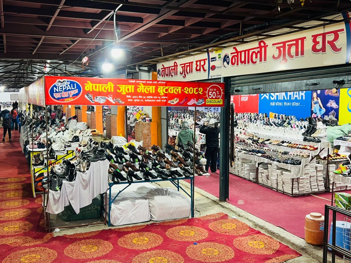 बुटवल । जुत्ता–चप्पलका विभिन्न डिजाइन र नेपाली ब्रान्डहरू एकै स्थानमा अवलोकन तथा खरिद गर्न सकिने जुत्ता–चप्पल भेराइटी मेला बुटवलमा सुरु भएको छ। नेपाली जुत्ता घर बुटवलको आयोजनामा सुरु भएको मेला पौष २० गतेदेखि माघ २० गतेसम्म सञ्चालन हुनेछ।