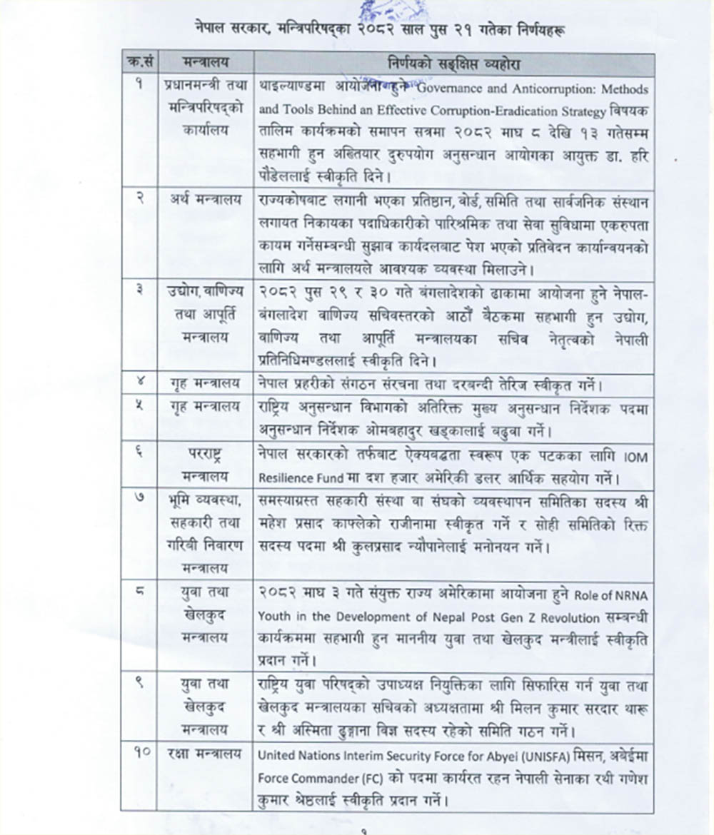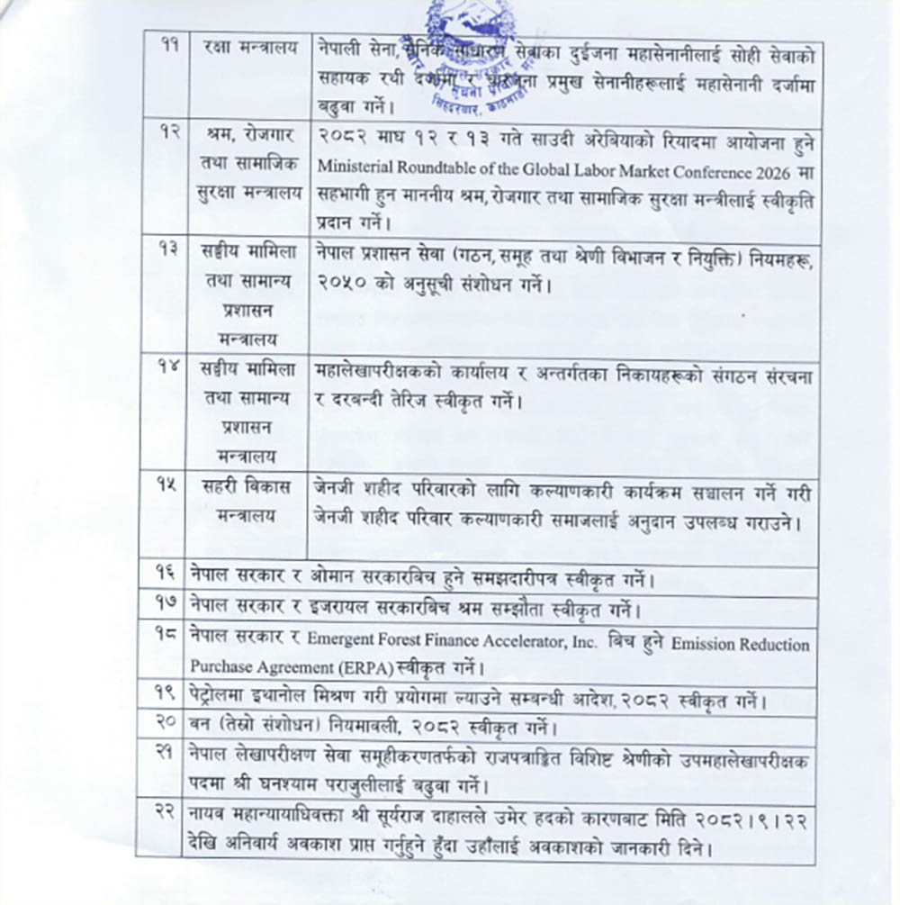 त्यस्तै बैठकले समस्याग्रस्त सहकारी संस्थाको सम्पत्ति व्यवस्थापन तथा दायित्व भुक्तानी सम्बन्धी कार्य गर्ने व्यवस्थापन समितिको सदस्य पदमा कुलप्रसाद न्यौपानेलाई मनोनयन गर्ने, जेनजी शहिद परिवारको लागि कल्याणकारी कार्यक्रम सञ्चालन गर्न जेनजी शहिद परिवार कल्याणकारी समाजलाई अनुदान उपलब्ध गराउने लगायतका निर्णय गरेको छ ।