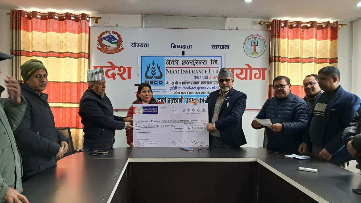 बुटवल।नेकाे इन्स्याेरेन्सले लुम्बिनी प्रदेश लाेक सेवा आगाेगलाई विमा वापतकाे दावी भुक्तानी गरेकाे छ । जेन-जी आन्दोलनका क्रममा उक्त कार्यालयका सवारी साधनमा भएको क्षतिवापत विमा कम्पनीले १ करोड ६४ लाख ८० हजार रुपैयाँ बराबरको दाबी भुक्तानी गरेकाे हाे ।