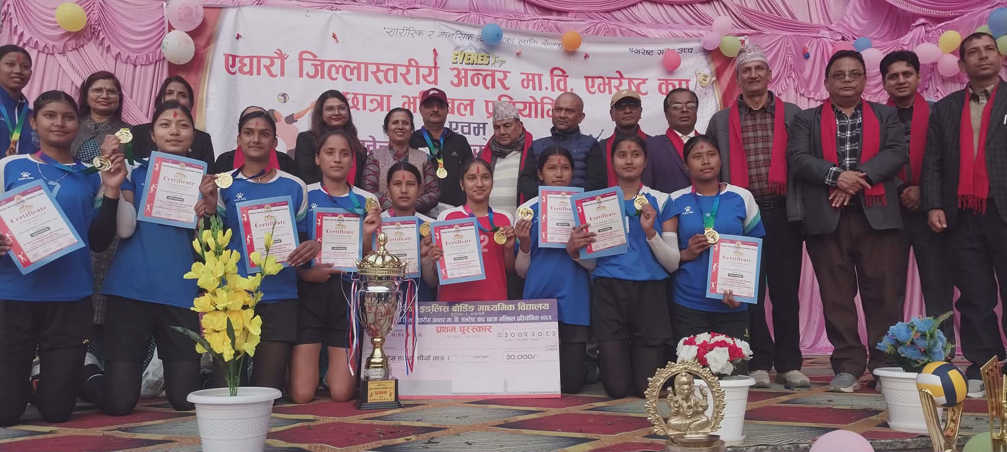 बुटवल । बुटवलमा सम्पन्न एघारौ जिल्ला स्तरीय अन्तर माबि एभरेष्ट कप छात्रा भलिबल प्रतियोगिताको उपाधि आयोजक एभरेष्ट ईगलिस बोर्डिङ माबिले चुमेको छ । बुधबार भएको फाईनलमा न्यू होराईजन ईगलिस बोर्डिङ माबिलाई ३-० को सोझो सेटमा पराजित गर्दै एभरेष्टले उपाधि चुमेको हो ।