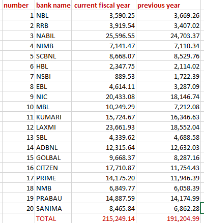 तथ्यांक अनुसार चालु आवको ५ महिनामा नेपाल बैंकले ३ अर्ब ५९ करोड रुपैयाँ, राष्ट्रि वाणिज्य बैंकले ३ अर्ब ९१ करोड ९५ लाख रुपैयाँ लगानी गरेको छ ।