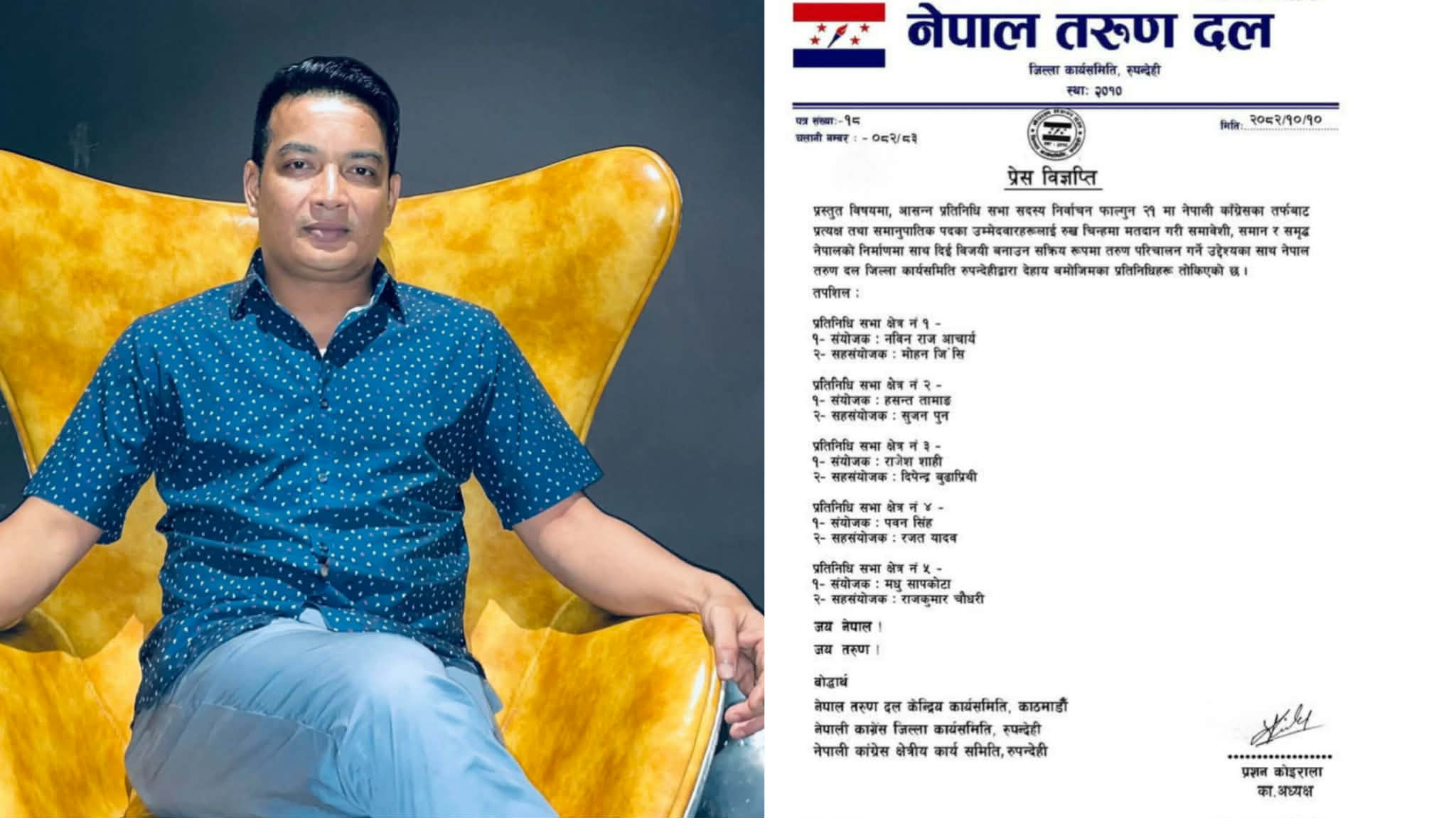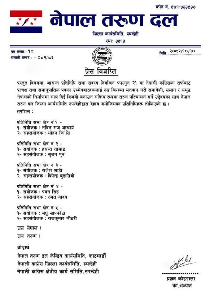 तरुण दलले संगठनलाई थप सक्रिय, अनुशासित र परिणाममुखी बनाउँदै चुनावी अभियानमा केन्द्रित गराउने उद्देश्यसहित उक्त जिम्मेवारी तोकिएको जनाएको छ।