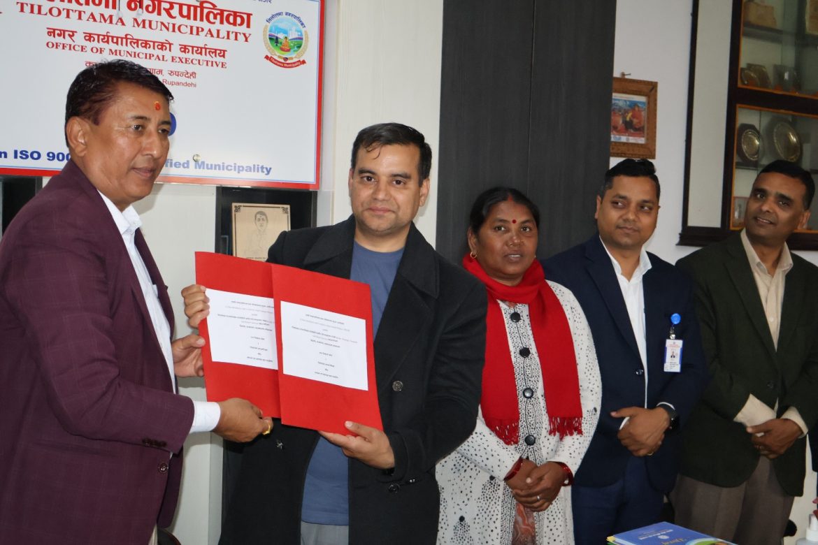तिलोत्तमा । तिलोत्तमा नगरपालिका र नगर विकास कोषबीच सहआयोजनामा विकास निर्माण अघि बढाउने उद्देश्यसहित सम्झौता सम्पन्न भएको छ। शहरी उत्थानशीलता तथा जीवनयापन सुधार आयोजना (URLIP) अन्तर्गत सहआयोजना निर्माण, सञ्चालन तथा व्यवस्थापन सम्बन्धी उपसहायक ऋण सम्झौतामा आज हस्ताक्षर गरिएको हो।