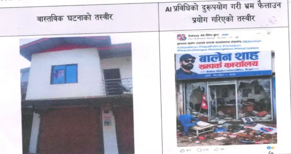 झापाको क्षेत्र नम्बर ५ स्थित कमल गाउँपालिका-२ मा रहेको राष्ट्रिय स्वतन्त्र पार्टीका उम्मेदवार बालेन शाहको सम्पर्क कार्यालयमा सामान्य क्षति भएको विषयलाई एआईको प्रयोग गरेर भ्रामक समाचार र तस्बीर प्रकाशित गरेको भन्दै प्रशासनले त्यस्ता गलत सूचना फैलाउने व्यक्ति र समूहको पहिचान गरिरहेको र कानुन बमोजिम कारवाही गर्ने चेतावनी दिएको हो ।