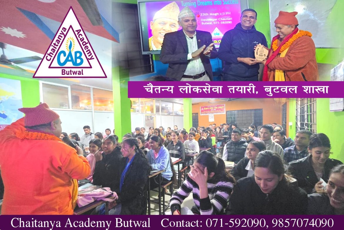 बुटवल । चैतन्य एकेडेमी नेपालको १२औँ वार्षिकोत्सवको अवसरमा बुटवल शाखाले युवा विद्यार्थीहरूको क्षमता अभिवृद्धि गर्ने लक्ष्यसहित दुईदिने विशेष कार्यशाला कार्यक्रम आयोजना गरी सम्पन्न गरेको छ। विद्यार्थीहरूमा जीवन उपयोगी सीप, सकारात्मक सोच र लक्ष्यप्रति स्पष्टता विकास गर्ने उद्देश्यले कार्यक्रम सञ्चालन गरिएको हो।
