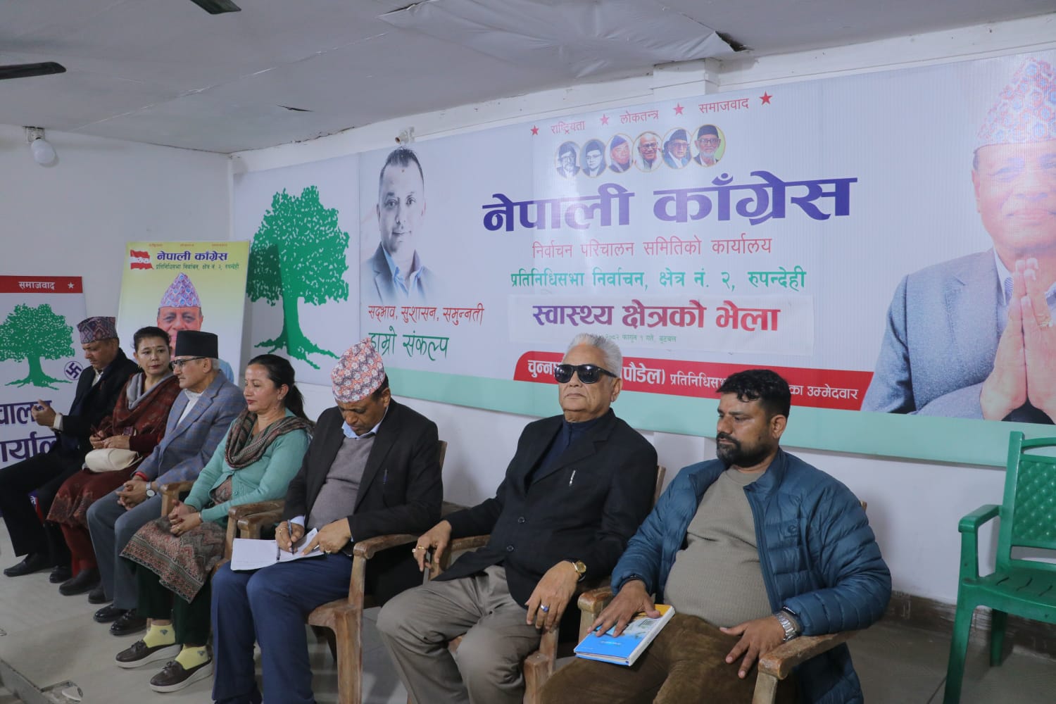 त्यस्तै नेपाली काँग्रेस रुपन्देही क्षेत्र नं. २ का सभापति तथा निर्वाचन परिचालन मुल समितिका संयोजक प्रजापाल गिरीले देशलाई अफ्ठ्यारो परेका बेला काँग्रेसले नै निकास दिँदै आएको र मुलुकका हरेक परिवर्तनमा काँग्रेसले नेतृत्व गरेको स्मरण गर्दै मुलुकको पुरानो विरासतलाई जोगाउने र जेन–जी आन्दोलनको मर्मअनुसार देश सम्हाल्ने तागत काँग्रेससंग मात्रै रहेको दावी गर्नुभयो । नेपाल किसान महासंघकी प्रदेश अध्यक्ष रिता खड्काको अध्यक्षतामा भएको कार्यक्रममा आसन्न निर्वाचनमा काँग्रेसका तर्फबाट प्रतिनीधि सभाकी समानुपातिक उम्मेद्वार रिता सेन, लक्ष्मण घिमिरे लगायतले भनाई राख्नुभएको थियो ।