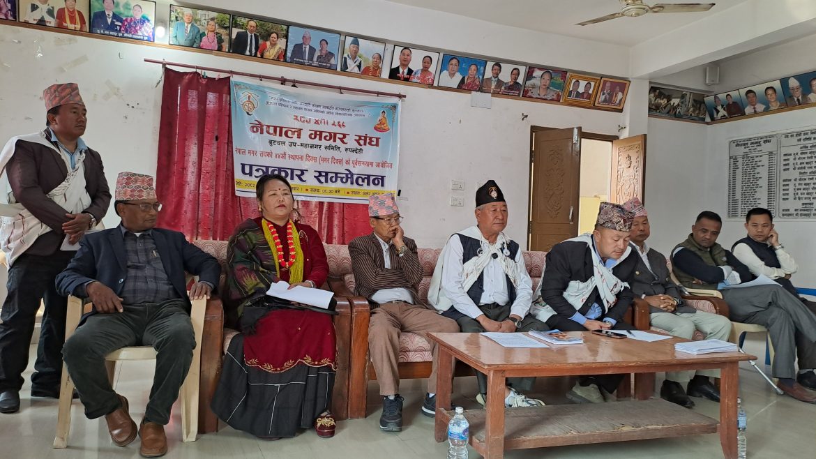 मगर समुदायको मौलिकता, पहिचान र अधिकारका सवाललाई उजागर गर्दै नेपाल मगर संघ बुटवल उपमहानगर समितिले मंगलबार बुटवलमा पत्रकार सम्मेलन गरी तीन दिने कार्यक्रमका साथ दिवस मनाउन लागेको जानकारी गराएको हो । २०३९ साल फागुन १५ गते सम्पन्न मगर समुदायको पहिलो राष्ट्रिय सम्मेलनको स्मरणमा हरेक वर्ष फागुन १५ गते ‘मगर दिवस’ मनाउने गरिन्छ । सोही अवसरमा यस वर्ष पनि समुदायको भाषा, संस्कृति, इतिहास र पहिचान संरक्षणका विषयलाई केन्द्रमा राखेर कार्यक्रम आयोजना गरिएको नेपाल मगर संघ रुपन्देहीका अध्यक्ष थर्कबहादुर बारघरेले बताए ।