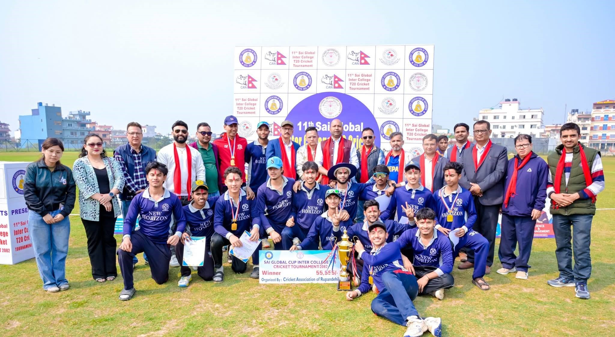 भैरहवा।न्यु होराइजन कलेजले ११औं संस्करणको जिल्लास्तरीय अन्तर कलेज साई ग्लोबल कप टी–२० क्रिकेट प्रतियोगिताको उपाधि हात पारेको छ । भैरहवामा सम्पन्न फाइनल खेलमा नेपथ्य कलेजलाई ४४ रनले पराजित गर्दै न्यु होराइजनले उपाधि हात पारेको हो ।