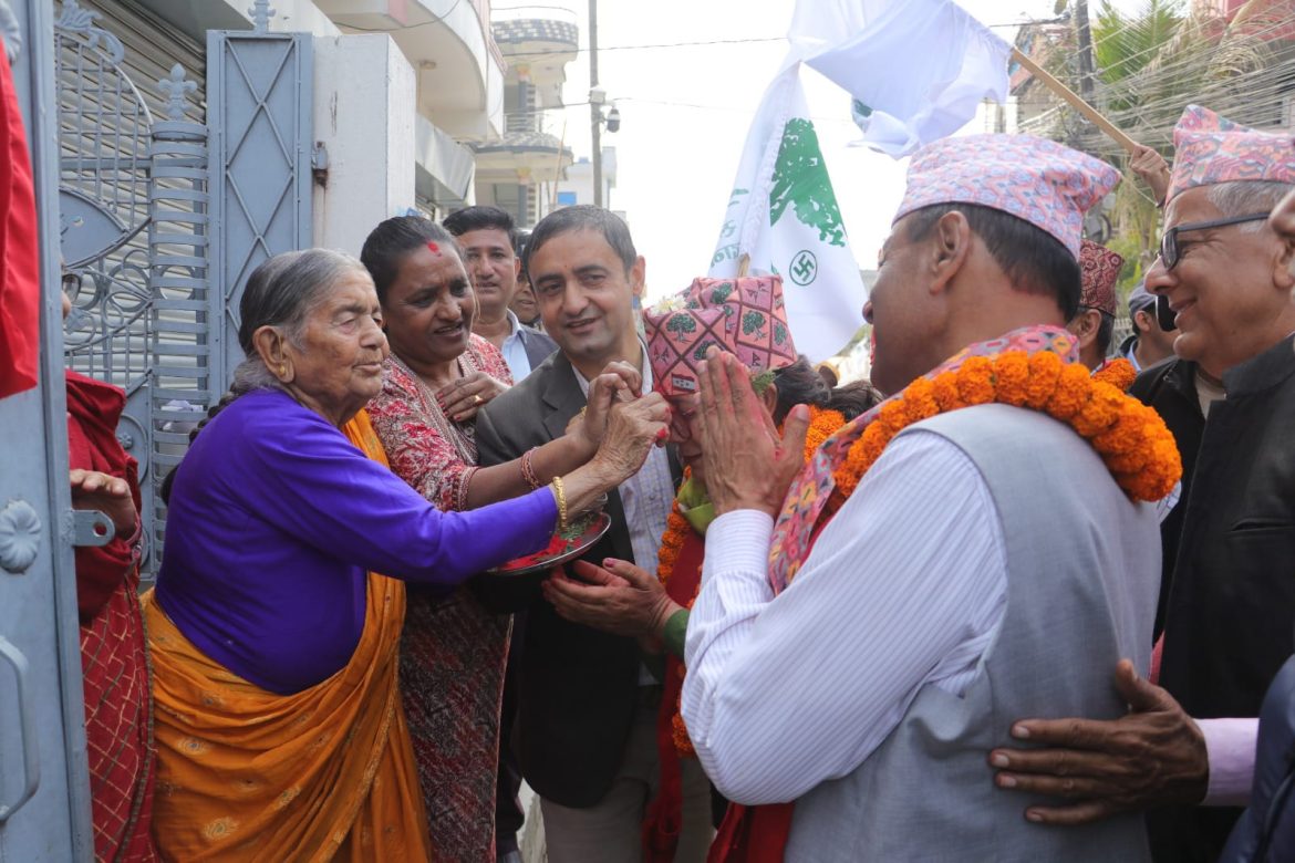 कतै गाडीमा त कतै पैदल घरदैलो गर्ने क्रममा मतदाताले उम्मेदवारहरू पौडेल र ओलीलाई फुलमाला र टीका लगाएर जितको शुभकामना दिएका थिए ।