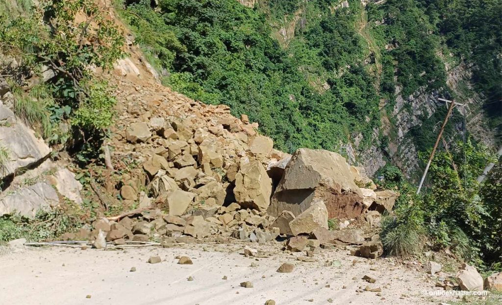 आज बिहानदेखि परेको वर्षासँगै सिद्धबाबा क्षेत्रमा लेदो सहित ढुङ्गा खसेपछि सवारी आवागमन ठप्प बनेको हो। सडक माथिबाट लगातार झर्ने ढुङ्गा र माटोका कारण उक्त खण्ड जोखिमपूर्ण बनेको छ।