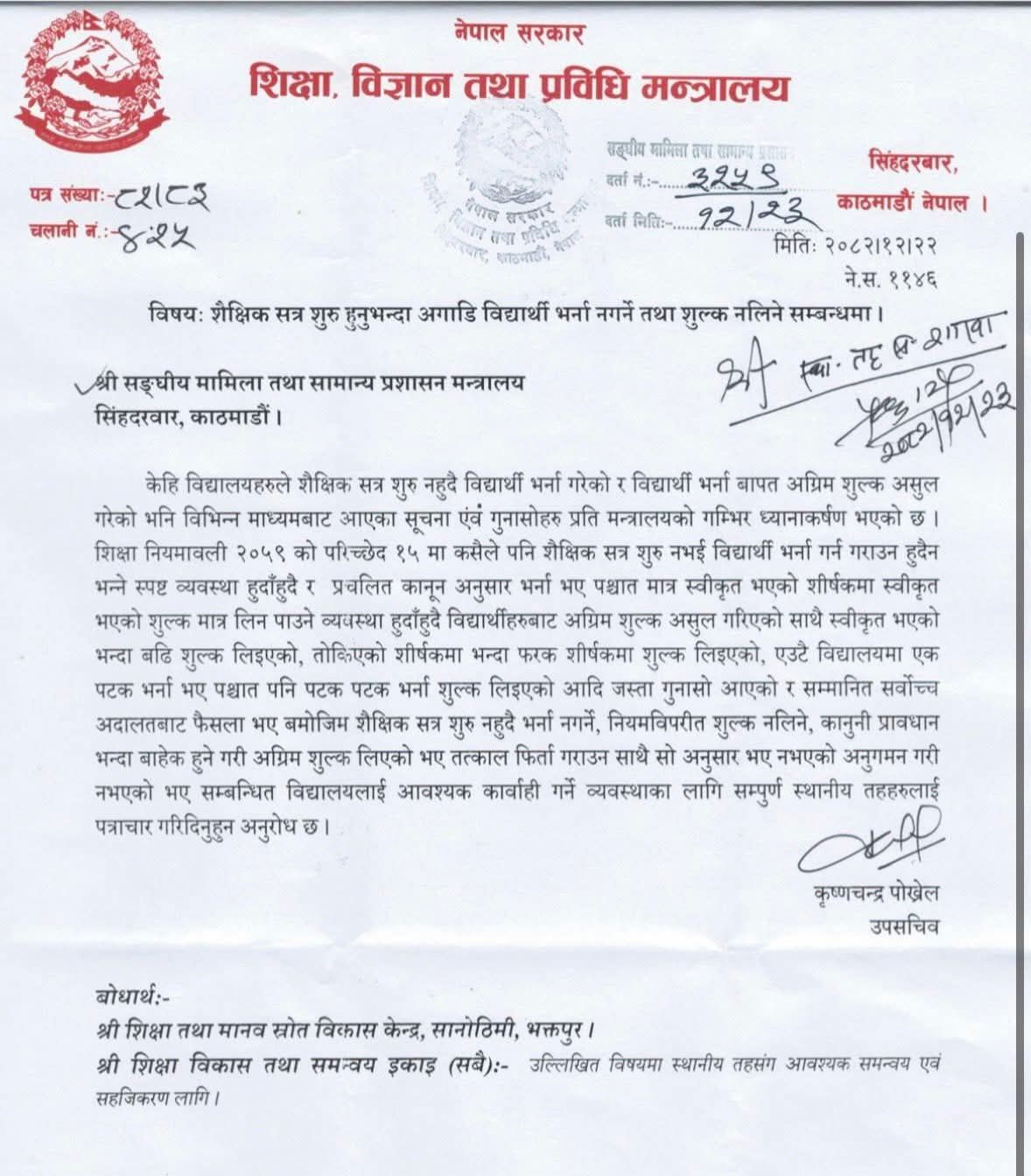 मन्त्रालयको पत्रमा भनिएको छ, ‘शिक्षा नियमावली २०५९ को परिच्छेद १५ मा शैक्षिक सत्र सुरू नभई विद्यार्थी भर्ना गर्न नपाइने स्पष्ट व्यवस्था छ । प्रचलित कानून र स्वीकृत शीर्षकभन्दा बाहिर गएर शुल्क लिनु गैरकानूनी हो ।’