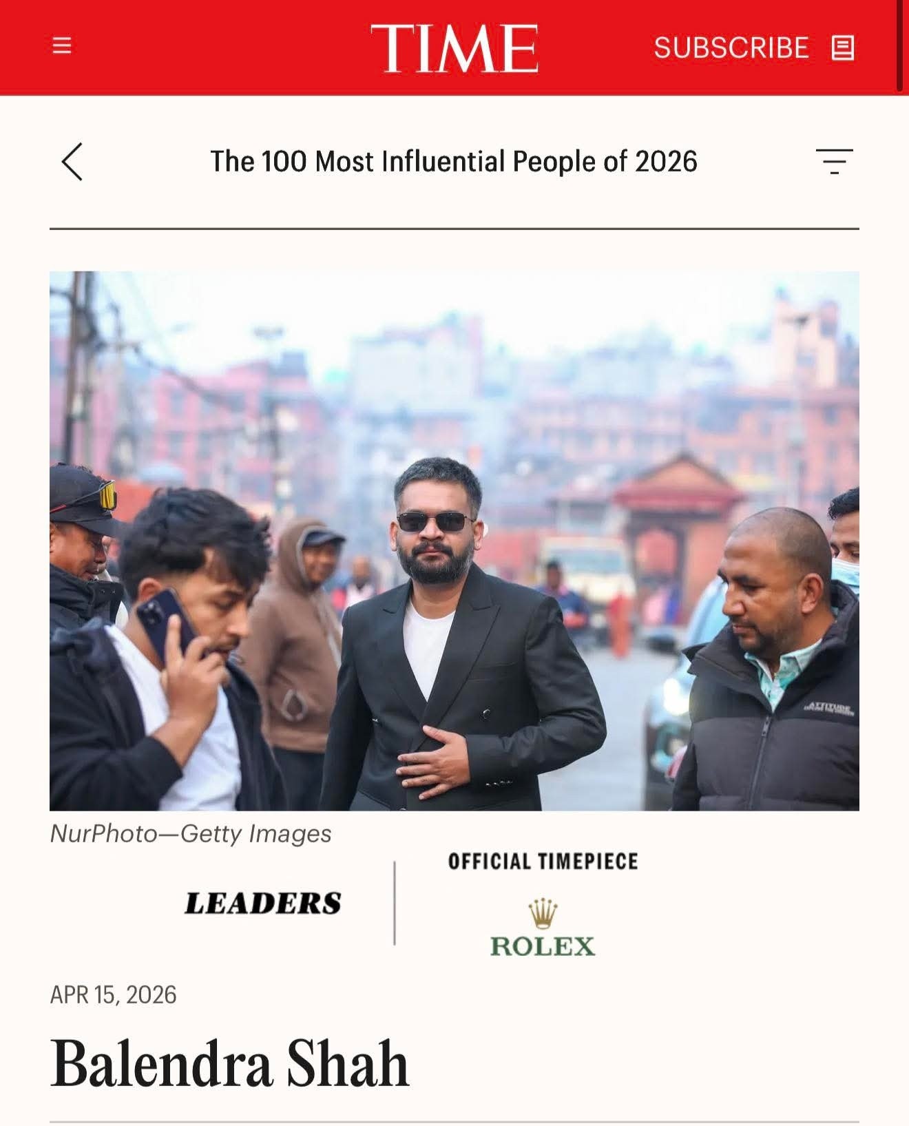 प्रधानमन्त्री बालेन्द्र शाह विश्वका १०० प्रभावशाली व्यक्तिहरूको सूचीमा समावेश भएका छन्। अन्तर्राष्ट्रिय सञ्चारमाध्यम टाइम पत्रिकाले सार्वजनिक गरेको सन् २०२६ का विश्वका १०० प्रभावशाली व्यक्तिहरूको सूचीमा शाहको नाम पनि समेटिएको हो।