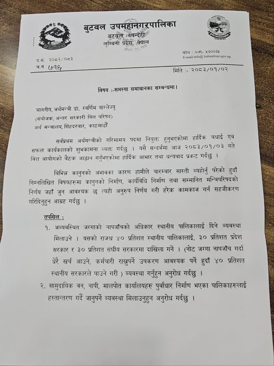 बुटवल । बुटवल उपमहानगरपालिकाले अन्तर सरकारी वित्त परिषद्को बैठकमा बुटवलका समस्या समाधानका लागि विभिन्न दश बुँदामा ध्यानाकर्षण गराएको छ । नगर प्रमुख खेलराज पाण्डेयले अर्थमन्त्री डा. स्वर्णिम वाग्लेले बोलाएको बैठकमा सरकारको ध्यानाकर्षण गराएका हुन् ।