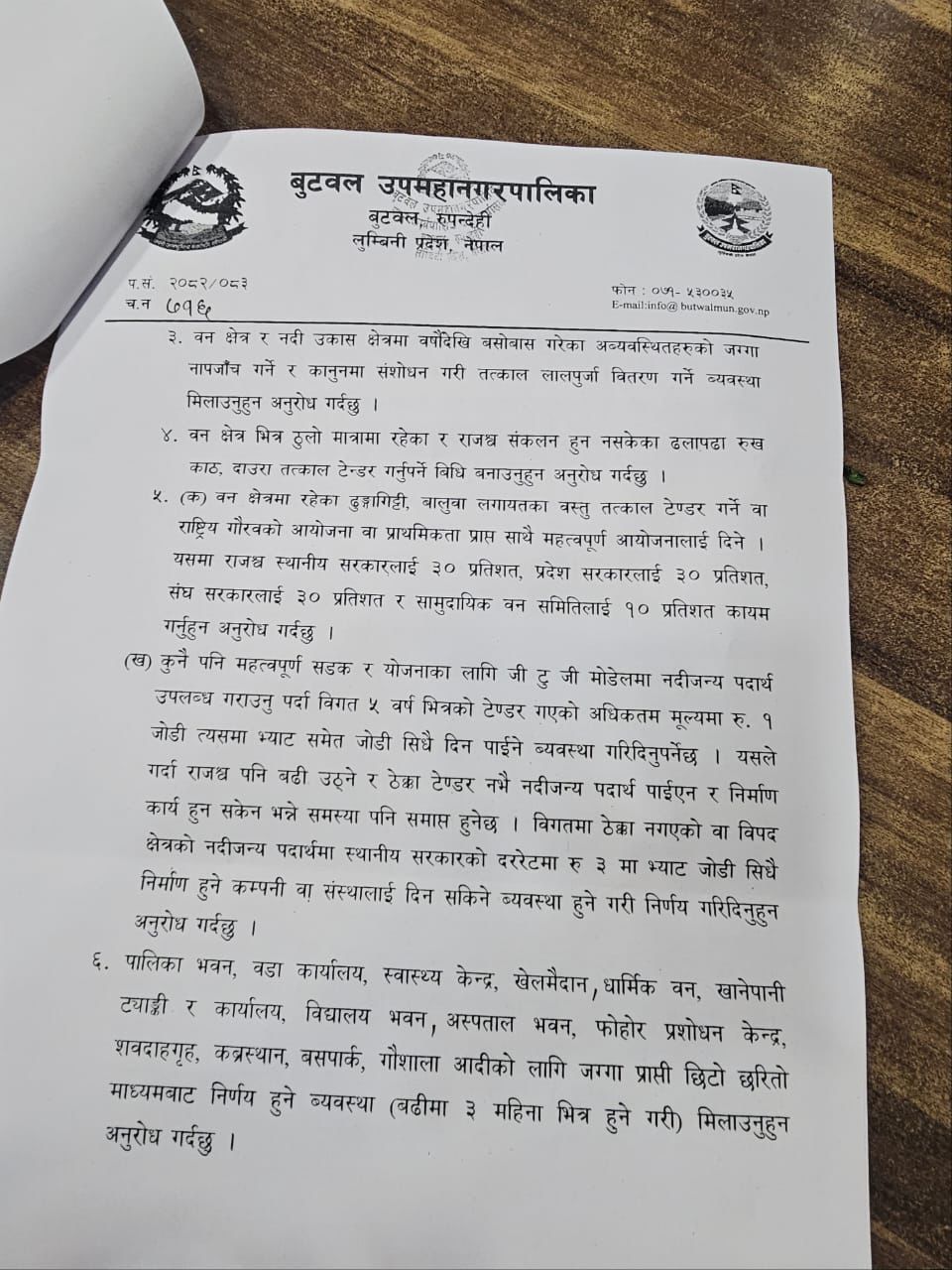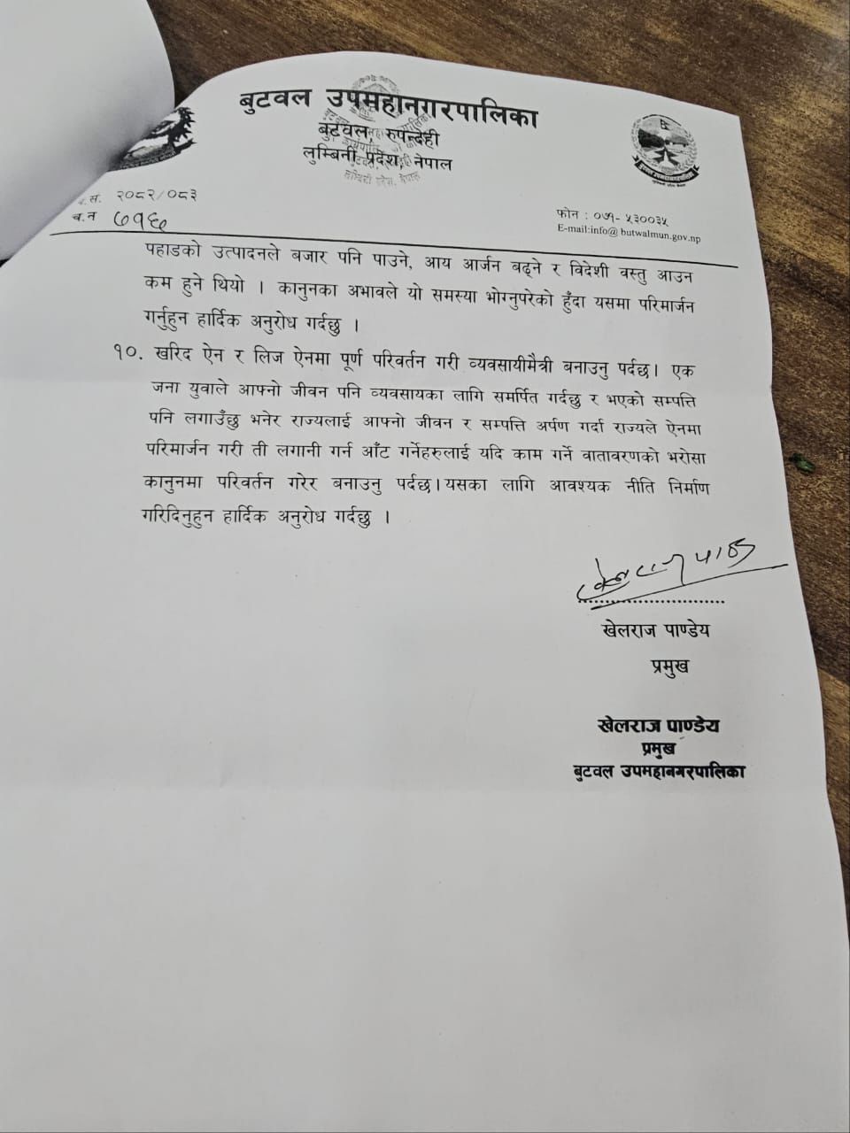 प्रमुख पाण्डेयले बुँदागतरुपमा धारणा राख्दै कानुनको अभावका कारण बारम्बार सास्ती बेहोर्नुपरेको हुँदा सहजीकरणका लागि आग्रह गरेका छन् । उनले अव्यवस्थित जग्गा, राजस्व, सामुदायिक वन, नापी लगायतका विषयमा बुँदागत रुपमा समस्याहरु जानकारी गराएका छन् । “अव्यवस्थित जग्गाको नापजाँचको अधिकार स्थानीय पालिकालाई दिने व्यवस्था मिलाउने । यसको राजश्व ४० प्रतिशत स्थानीय पालिकालाई, ३० प्रतिशत प्रदेश सरकार र ३० प्रतिशत संघीय सरकारमा दाखिला गर्ने व्यवस्था गर्नुहुन अनुरोध गर्दछु,” पहिलो बुँदामा पाण्डेयले भनेका छन् । त्यसैगरी सामुदायिक वन, नापी, मालपोत कार्यालयहरु पूर्वाधार निर्माण भएका पालिकाहरुलाई हस्तान्तरण गर्दै जानुपर्ने व्यवस्था मिलाउन अनुरोध गरेका छन् ।