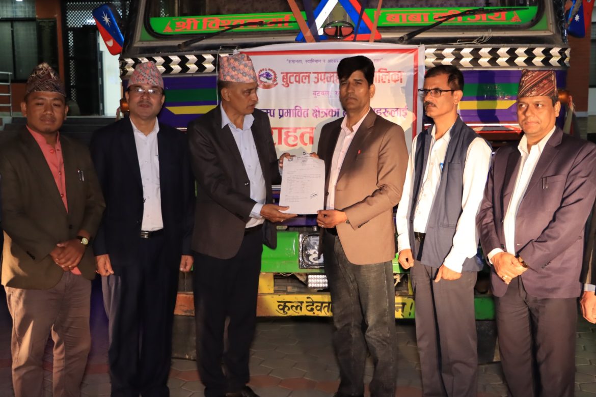 राहत सामग्री लिएर बुटवल उपमहानगरपालिकाका २ जना कर्मचारी र २ जना पत्रकार जाजरकोट प्रस्थान गरेको प्रमुख प्रशासकीय अधिकृत विष्णु प्रसाद भुसालले बताए। उनले अहिले बुटवल उपमहानगरपालिकाकै श्रोतबाट एकट्रक राहत सामग्री पठाइएको र बुटवलका संघसंस्थाहरुको राहत सामग्री संकलन भएपछि पुन: सामग्री पठाउने बताए।