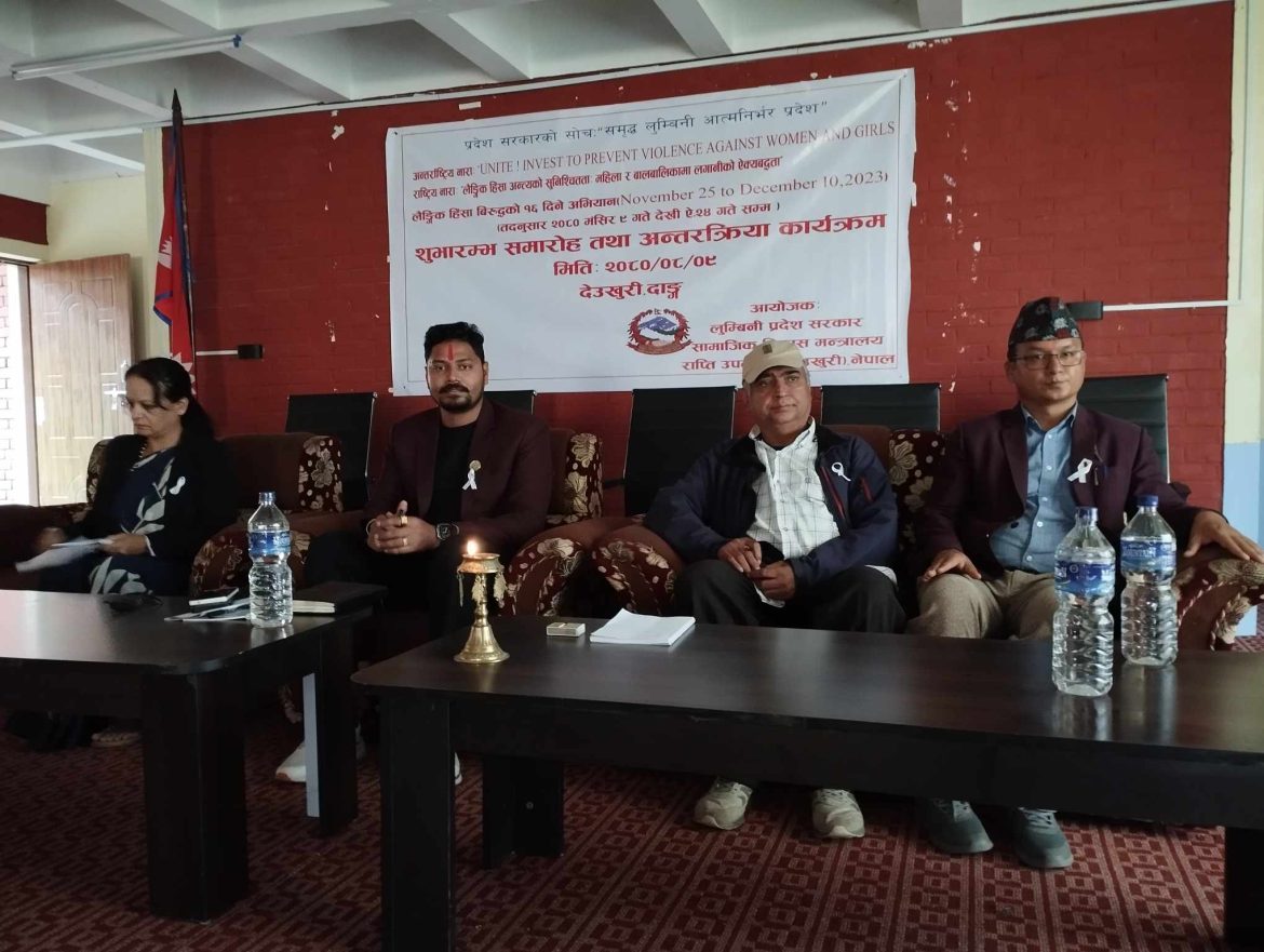देउखुरी । “लैङ्गिक हिंसा अन्त्यको सुनिश्चितता ः महिला र बालबालिकामा ऐक्यबद्धता” भन्ने मुल नारा सहित लैंङ्गिक हिंसाविरुद्धको १६ दिने अभियान सुरु भएको छ । शनिवार लुम्बिनी प्रदेशको सामाजिक विकास मन्त्रालयले राजधानी देउखुरीमा एक कार्यक्रमको अयोजना गरी अभियान सुरु गरिएको हो । सामाजिक विकास मन्त्री चन्द्रकेश(सिके) गुप्ताले लैंङ्गिक हिंसाविरुद्धको १६ दिने अभियानको शुभारम्भ गरेका हुन् ।