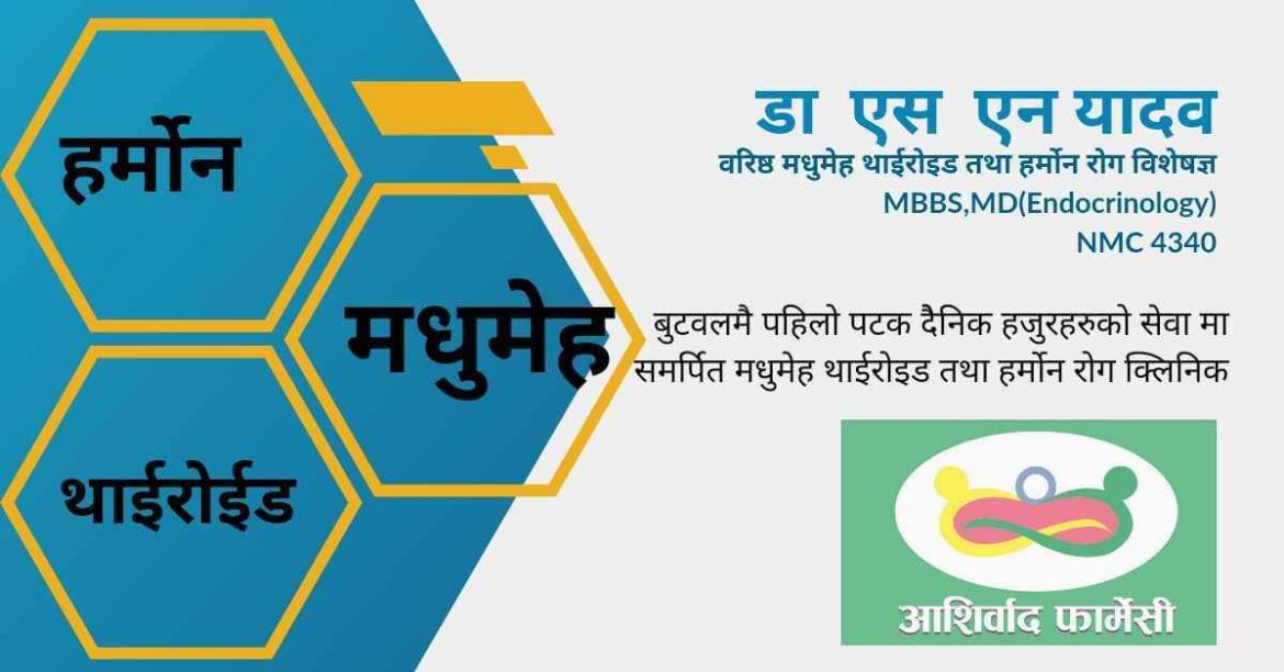 नेपाल मेडिकल काउन्सिल वाट इन्डोक्राईनोलोजिस्ट सम्वन्धन प्राप्त गरेका र लामो समय देखि नारायणि उपक्षेत्रीय अस्पताल विरगन्जमा सेवा दिएका वरिष्ठ इन्डोक्राईनोलोजिस्ट डा एस एन यादव द्वारा दैनिक रुपमा चेकजाच तथा परामर्स बुटवल अस्पताल लाइन मैत्रीपथमा रहेकाे आशिर्बाद फार्मेसीमा भैरहेको फार्मेसीकि सन्चालक कल्पना घिमिरेले वताइन।
