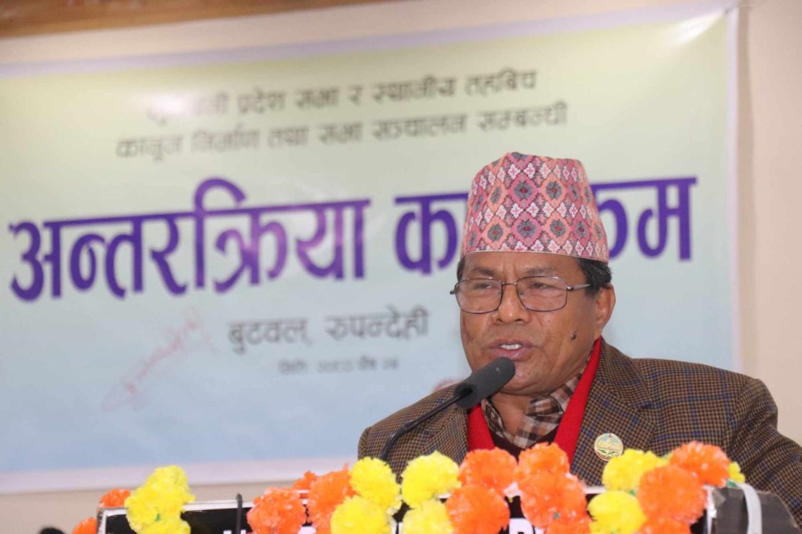 बुटवल । लुम्बिनी प्रदेशका सभामुख तुलाराम घर्ती मगरले कानुन निर्माणमा स्थानीय तह सक्षम हुन जरुरी रहेको बताउनु भएको छ । लुम्बिनी प्रदेश सभा सचिवालयको आयोजनामा आज बुटवलमा भएको लुम्बिनी प्रदेश सभा र स्थानीय तहबीच कानुन निर्माण तथा सभा संचालन सम्बन्धि अन्तरकृया कार्यक्रमलाई सम्बोधन गर्नु हुँदै उहाँले कानुनी र संबैधानिक ब्यवस्था अनुसार स्थानीय तहसंग कानुन निर्माणमा सहकार्य समन्वय र सहजीकरण गरिएको जानकारी दिनु भयो । सभामुख घर्ती मगरले बिकास निर्माणसंगै कानुन निर्माणमा पनि ध्यान दिनु जरुरी रहेको बताउनु हुँदै कानुन निर्माणमा सानो गल्तीले दीर्घकालीन असर पुग्ने भएकाले संबेदनसिल रहेको बताउनु भयो ।