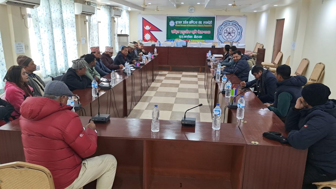 बुटवल उद्योग वाणिज्य संघले यहि फागुनमा बुटवलमा सञ्चालन गर्न गईरहेको प्राङ्गारिक कृषि मेलाको सन्दर्भमा परामर्श बैठक गरिएको छ । बुधबार संघको सचिवालयमा आयोजना गरिएको बैठकमा कृषिसंग सम्बन्धित सरकारी संस्थाका प्रमुख तथा प्रतिनीधि, संघका परामर्शदाता लगायतको सहभागिता रहेको थियो । संघको आयोजनामा फागुन १० देखि १४ गतेसम्म बुटवलमा प्राङ्गारिक कृषि मेला हुँदैछ ।