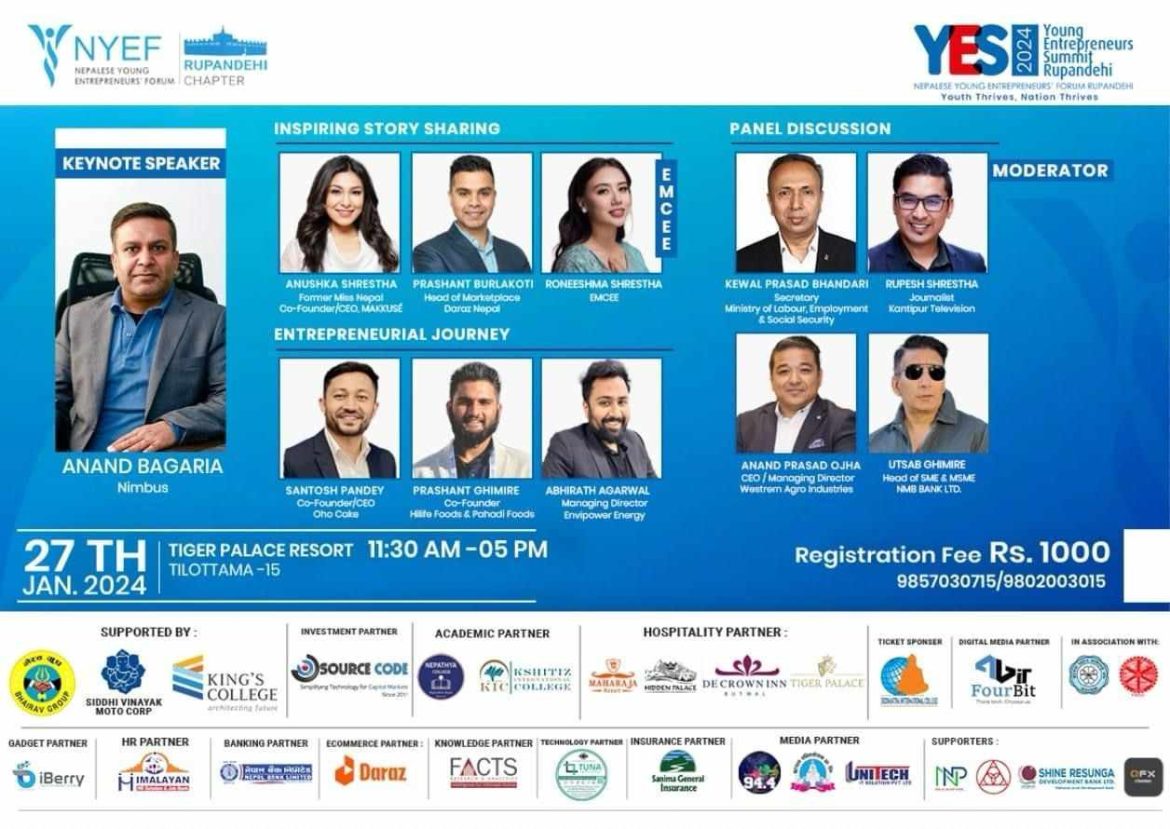सम्मेलनमा ज्योती ग्रुपका डाईरेक्ट सौरभ ज्योती प्रमुख अतिथीको रुपमा आउनुहुनेछ । त्यस्तै निम्बुज ग्रुपका आनन्द बगारिया प्रमुख वक्ताको रुपमा आउनुहुनेछ । सम्मेलनमा समुहगत छलफल गरिने छ । जसमा श्रम, रोजगार तथा सामाजिक सुरक्षा मन्त्रालयका सचिव केवलप्रसाद भण्डारी, कान्तिपुर टेलिभिजनका रुपेश श्रेष्ठ, युवा उद्यमी मञ्च रुपन्देहीका संस्थापक अध्यक्ष आनन्द वझा र एनएमवि बैंकका साना तथा मझौला उद्यमी कर्जाशाखा प्रमुख उत्सव घिमिरेले समुहगत छलफलमा मध्येस्थकर्ताको भूमिका निर्वाह गर्नुहुनेछ ।