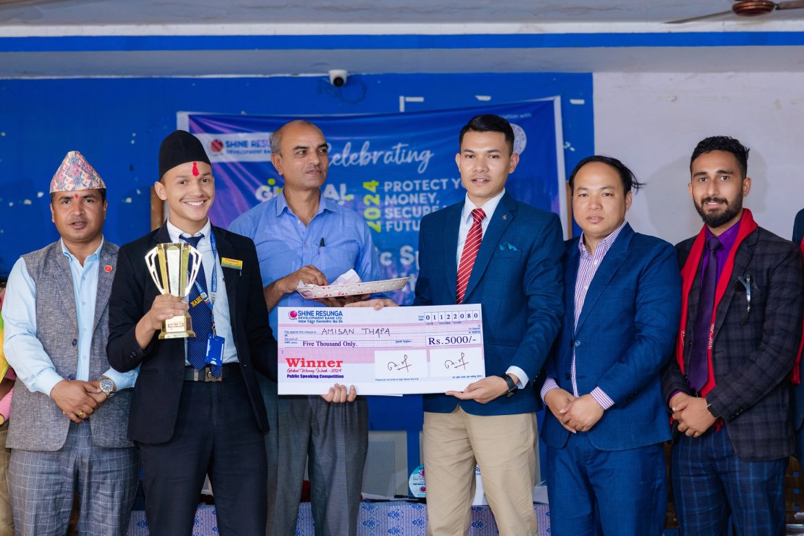 उनीहरुलाई बैंकका चिफ एचआर अफिसर तथा ब्राण्डिङ हेड प्रभास राई तथा विद्यालयका प्राचार्य प्रेमबहादुर बस्नेतले नगद पुरस्कार प्रमाणपत्र र ट्रफी प्रदान गरे । विद्यार्थीहरुले क्रमशः ५ हजार, ३ हजार र २ हजार नगद पुरस्कार पाए । मार्च १८ मा शुरु भई मार्च २४ सम्म चल्ने ग्लोबल मनि वीक अवधिमा बैंकले नेपाल राष्ट्र बैंकले आयोजना गर्ने वित्तीय साक्षरता लगायत कार्यक्रममा सक्रिय सहभागिता जनाउनुका साथै शाइन रेसुंगाका नयां बानेश्वर, भैरहवा, फर्साटिकर, नवलपुरको कावासोती, पश्चिम नवलपरासीको भुमही, गुल्मीको बलेटक्सार, प्युठानको बाग्दुला र बर्दियाको बासगढीमा वित्तीय साक्षरता कार्यक्रम सञ्चालन गरिरहेको चिफ एचआर अफिसर राईले जानकारी दिए ।