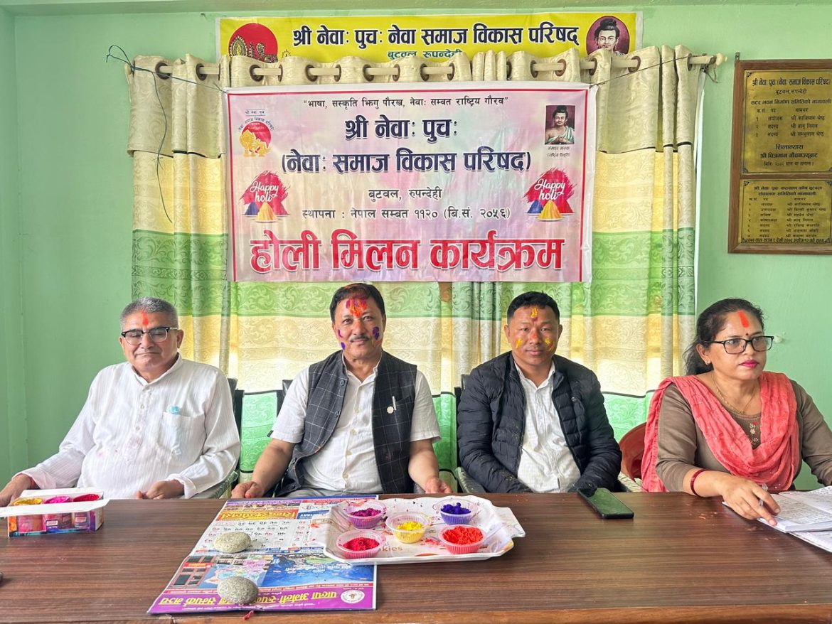 बुटवल । नेवाः पुचः (नेवाः समाज विकास परिषद्) केन्द्रिय कार्यलयले बुटवलमा आइतबार होली मिलन कार्यक्रम सम्पन्न गरेको छ । संस्थाका अध्यक्ष काजीमान श्रेष्ठको अध्यक्षतामा आयोजना कार्यक्रममा समाजका पदाधिकारी, सदस्य, नेवारी समुदायका अन्य संघसंस्था तथा पत्रकारको सहभागीतामा रंग लगाएर होली मनाएका थिए ।