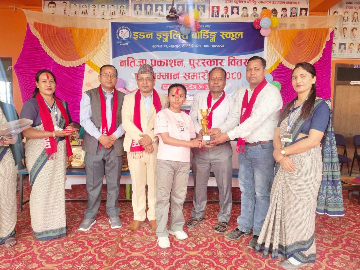 इडन इङ्गलिस बाेर्डिङ स्कुल बुटबल ११ नहरपुरले नतिजा प्रकाशन पुरस्कार वितरण एवं सम्मान समारोह 2080 सम्पन्न गरेकाे छ । । कार्यक्रममा बाेल्दै कार्यक्रमका प्रमुख अतिथि बुटवल उपमहानगरपालिका शिक्षा शाखा उप निर्देशक टिकाराम पन्थिले विद्यालयलाई उत्कृष्ट नतिजाका साथ राेजगारीमुलक क्षेत्रलाई लत्क्षित गरि संचालन गर्नु निकै राम्रो कुरा रहेकाे बताउनुभयाे । प्याप्सन रुपन्देहीका अध्यक्ष तथा कार्यक्रमका विशिष्ट अतिथि मित्रहरि आचार्यले निजि विद्यालयहरुले शिक्षा क्षेत्रमा निकैनै ठूलाे याेगदान गरेकाे बताउदै अभिभावकहरुले ढुक्क भयर निजि विद्यालयहरुमा आफ्ना छाेराछाेरिलाई पढाउनु पर्ने बताउनुभयाे ।