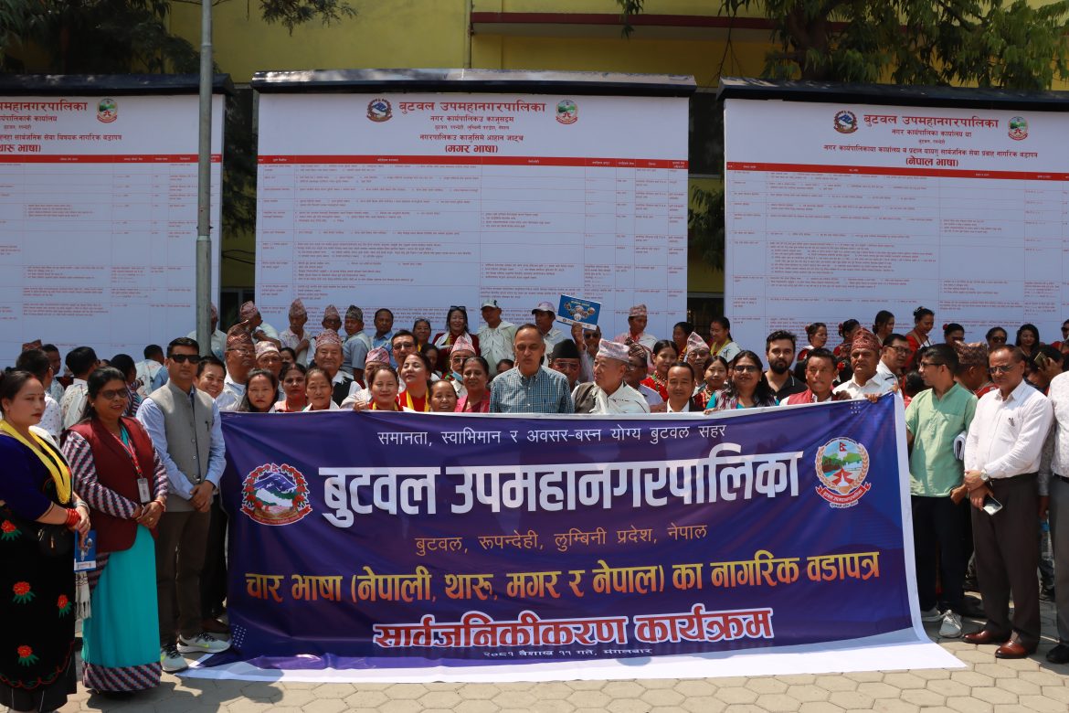 बुटवल उपमहानगरमा बसोबास गर्नेमध्ये जनसंख्याको अनुपातका आधारमा ४ भाषामा तयार गरिएको नागरिक बडापत्र मंगलबार एक कार्यक्रमका बीच नगर प्रमुख खेलराज पाण्डेयले सार्वजनिक गरे।