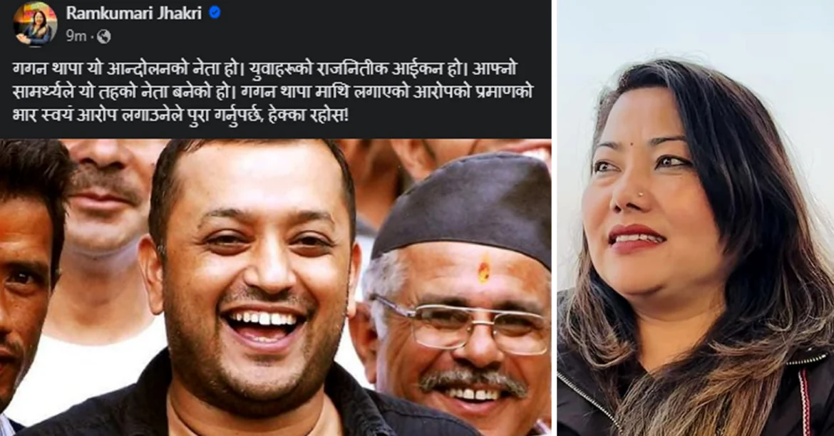 झाँक्रीले सामाजिक सञ्जालमार्फत भनेकी छन्, ‘गगन थापा यो आन्दोलनको नेता हो । युवाहरूको राजनीतिक आईकन हो । आफ्नो सामर्थ्यले यो तहको नेता बनेको हो । गगन थापामाथि लगाएको आरोपको प्रमाणको भार स्वयं आरोप लगाउनेले पूरा गर्नुपर्छ । हेक्का रहोस् ।’