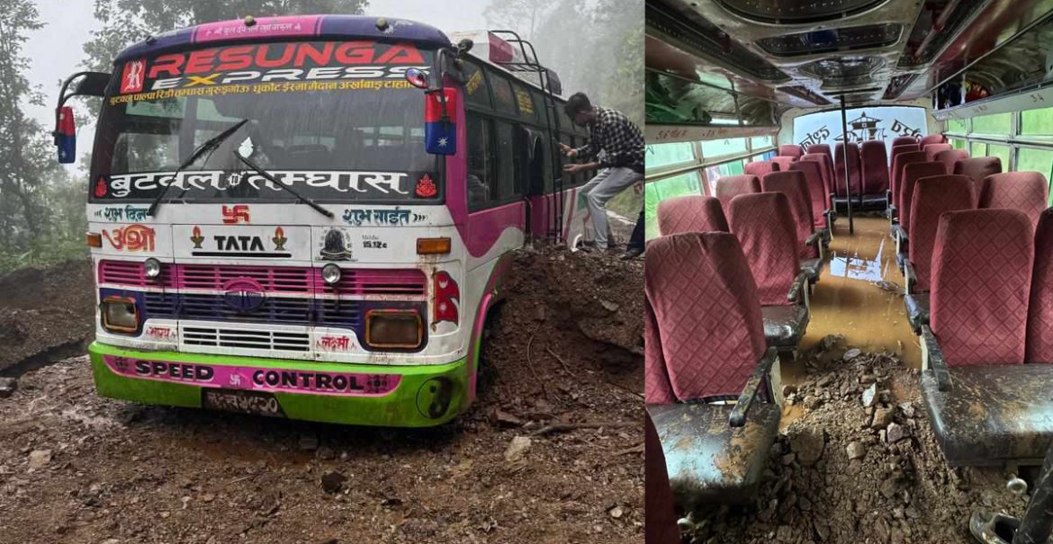 गुल्मी। गुल्मीमा गुडिरहेको बसभित्र लेदो सहितको पहिरो खसेको छ। गुल्मीको रूरू क्षेत्र गाउँपालिका वडा नं. १ रातामाटामा गुडिरहेको बसभित्र लेदोसहितको पहिरो खसेको हो।