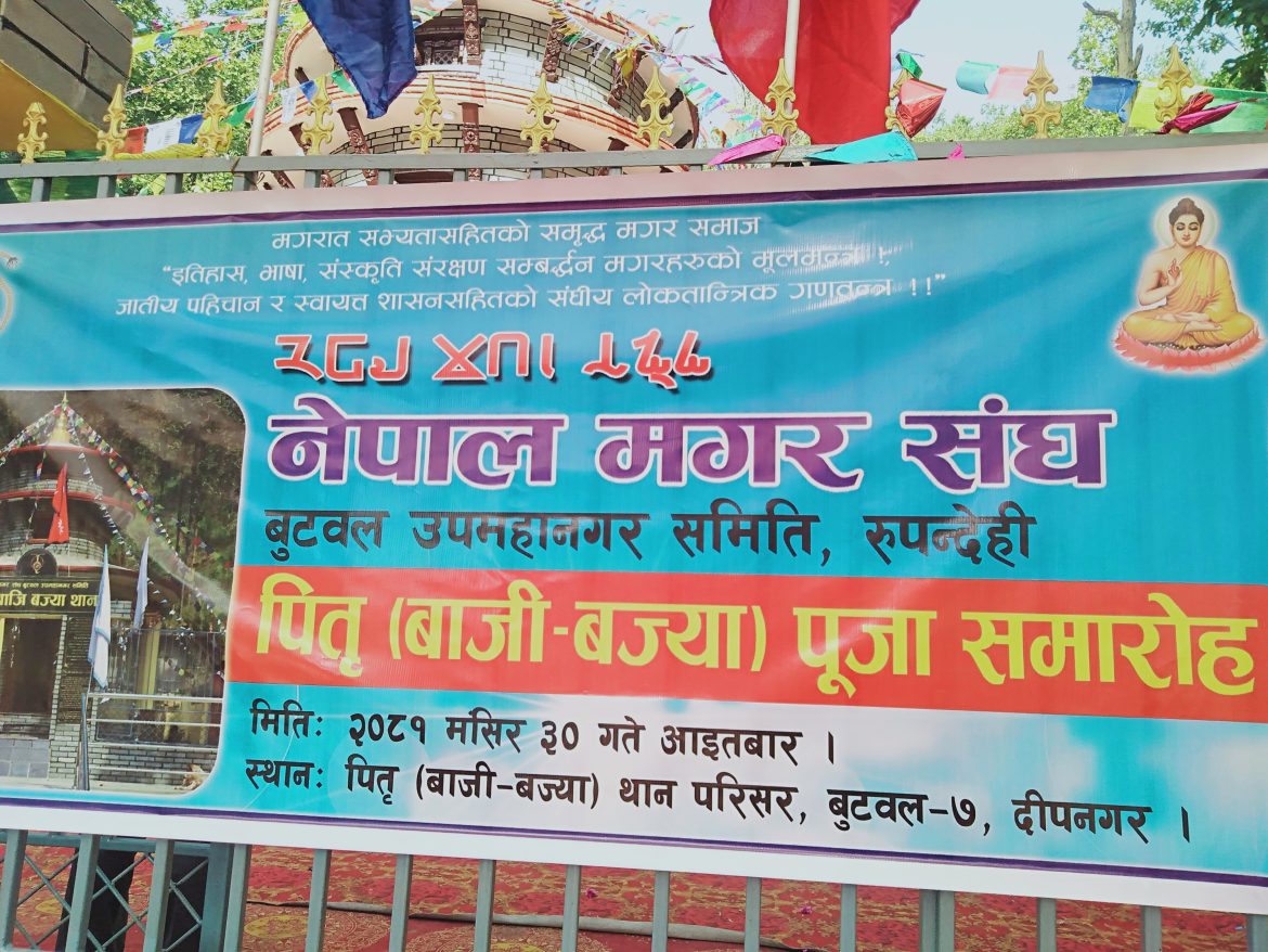 बुटवल। बुटवलको दीपनगर स्थित बाजेबजै स्थानमा मगर समुदायले आफ्नो परम्परागत पितृ पूजा सम्पन्न गरेका छन्। नेपाल मगर संघ बुटवल उपमहानगर समितिको नेतृत्वमा आयोजित यो पूजा आइतबार सम्पन्न भएको हो।