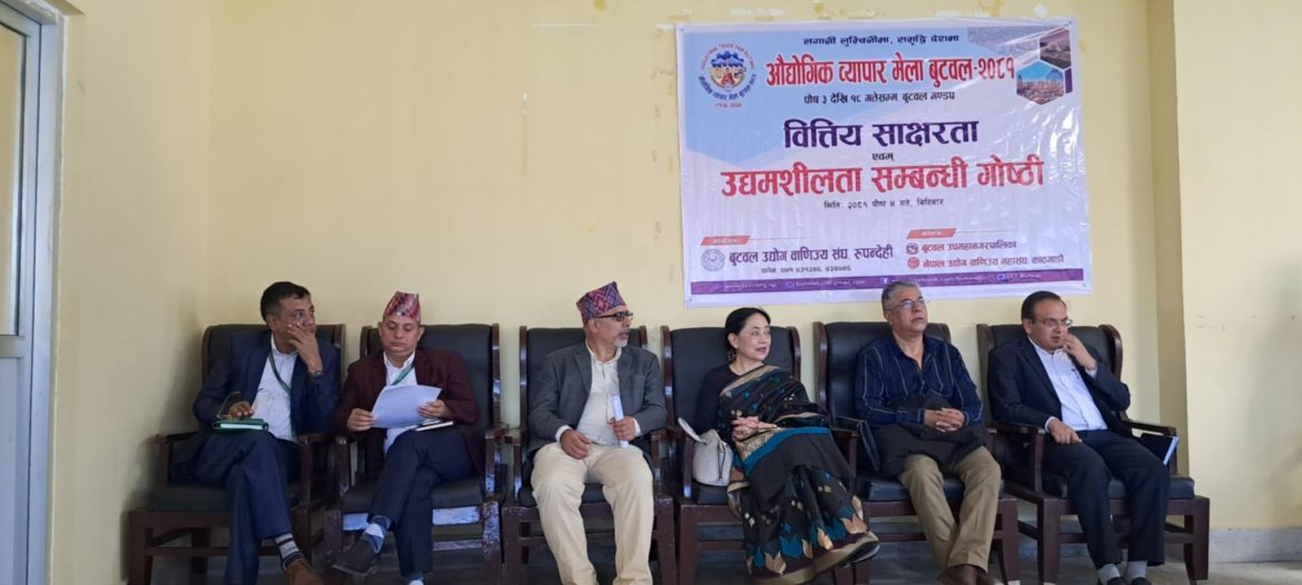 बुटवलमा बुधबारदेखि सुरु भएको औद्योगिक व्यापार मेलाको अवसरमा बिहिबार वित्तिय साक्षरता एवं उद्यमशिलता सम्बन्धि गोष्ठि गरिएको छ । कार्यक्रममा नेपाल राष्ट्र बैंकका पुर्ब गभर्नर डा. चिरञ्जिवी नेपालले देशको आर्थिक विकासका लागि आर्थिक नीति सहि हुनुपर्ने भन्दै आर्थिक नीति बनाउदा अल्पकालिन र दिर्घकालिन प्रभावको बारेमा सोचेर बनाउनुपर्नेमा जोड दिनुभयो ।
