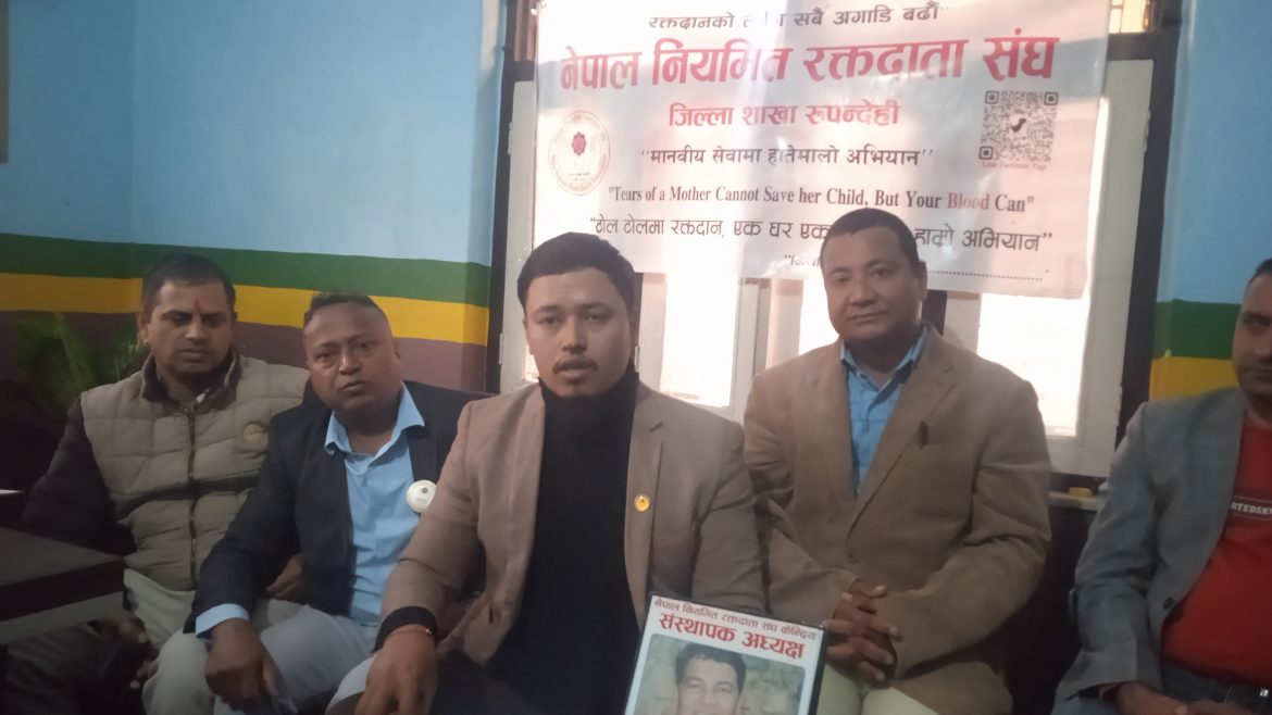 बुटवल । नेपाल नियमित रक्तदाता संघ, जिल्ला शाखा रुपन्देहीले “मानवीय सेवामा समर्पित अभियान” भन्ने नाराका साथ रक्तदान जीवनदान अभियान सुरु गरेको छ। यस अभियानले जिल्लाका विभिन्न गाउँपालिका र नगरपालिकामा रक्तदान कार्यक्रम सञ्चालन गर्दै निःशुल्क स्वास्थ्य सेवा उपलब्ध गराउने उद्देश्य लिएको छ।