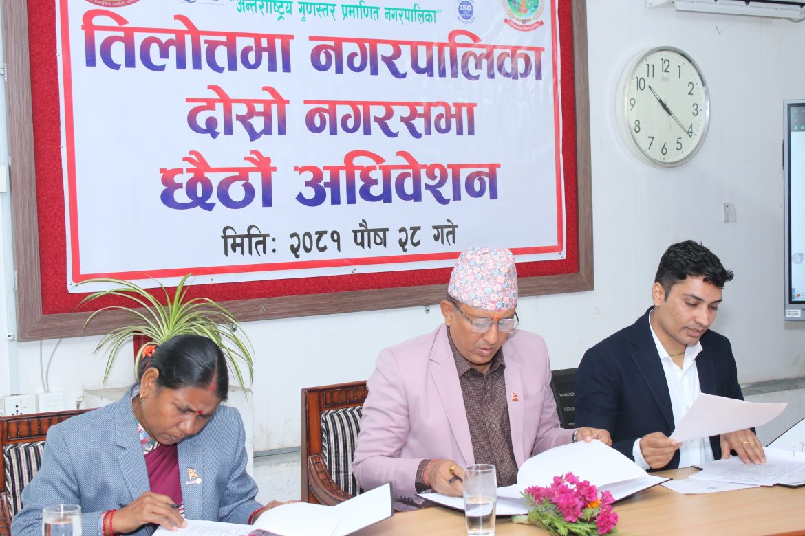 तिलोत्तमा।तिलोत्तमा नगरपालिकाको दोस्रो नगर सभाको छैठौ अधिवेशनको विभिन्न प्रस्तावका ऎन पास गर्दै सम्पन्न भएको छ ।नगर प्रमुख रामकृष्ण खाणको अध्यक्षतामा भएको बैठकले नगरपालिकाको आर्थिकऐन,२०८१(प्रथम संशोधन २०८१) पारित गरेको छ।त्यस्तै नगरपालिकाको विभिन्न बाँकी रहेका कार्यपालिकाका निर्णयहरु सर्वसम्मतले पारित गरेको छ। सुशासन तथा संस्थागत बिकास समितिका संयोजक तथा कार्यपालिका सदस्य राधा शाहीले प्रस्तुत गरेका कार्यपालिकाका निर्णयहरु सर्वसम्मत पास भएको हो।
