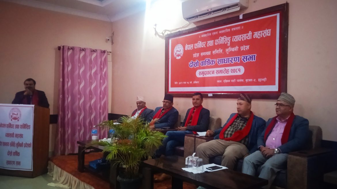 बुटवल। नेपाल फर्निचर तथा फर्निसिङ व्यवसाय महासंघ, लुम्बिनी प्रदेश समन्वयको दोस्रो वार्षिक साधारण सभा बुटवलमा सम्पन्न भएको छ। “व्यवसायिक एकता, व्यवसायिक सफलता” नारासहित अगाडि बढेको महासंघको औपचारिक उद्घाटन महासंघका केन्द्रीय अध्यक्ष युवराज पौडेलले गरे।
