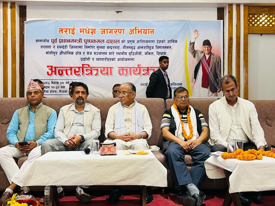 माओवादी केन्द्रको जनतासंग माओवादी हुलाकी मार्ग जागरण अभियानको क्रममा आयोजित कार्यक्रममा बोल्ने वक्ताहरुले देशको आर्थिक तरलता, युवाको विदेश पलायनसंगै रुपन्देहीमा बनेका सुख्खा बन्दरगाहा, गौतमबुद्ध अन्तराष्ट्रिय विमानस्थल, मोतिपुर औद्योगिक क्षेत्र र सेज संचालनबारे विचार राखे । सरकारले आश्वासन मात्र दिएको उल्लेख गर्दै उनीहरुले रुपन्देहीको आर्थिक र पर्यटन विकासको लागि सदनमा आवाज उठाउन माओवादी केन्द्रलाई आग्रह गरे ।