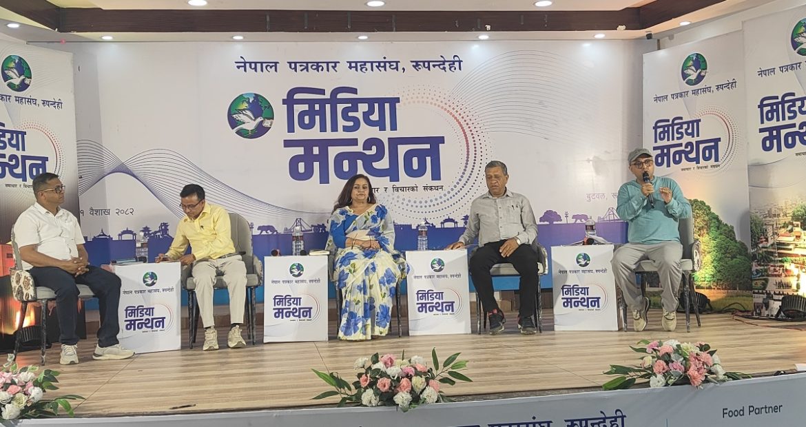 बुटवल । नेपाल पत्रकार महासंघ रुपन्देहीको आयोजनामा विहिबार बुटवलमा मिडिया मन्थन सम्पन्न भएको छ । विभिन्न विषयमा गरिएको समुहगत बहस कार्यक्रममा सहभागीहरुले पत्रकारिता पेशालाई थप निष्पक्ष, व्यवसायीक र जनमुखी बनाउँदै लैजानु पर्नेमा जोड दिएका छन् ।