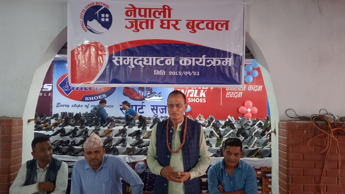 बुटवल। कालिकानगरमा स्थानीय युवाहरूको संयुक्त लगानीमा ‘नेपाली जुत्ता घर’ नामको नयाँ जुत्ता बिक्री केन्द्र सुरु भएको छ। बुटवल उपमहानगरपालिका–१२ मा खुलेको यो केन्द्रको मंगलबार नगरप्रमुख खेलराज पाण्डेयले उद्घाटन गरेका हुन्।
