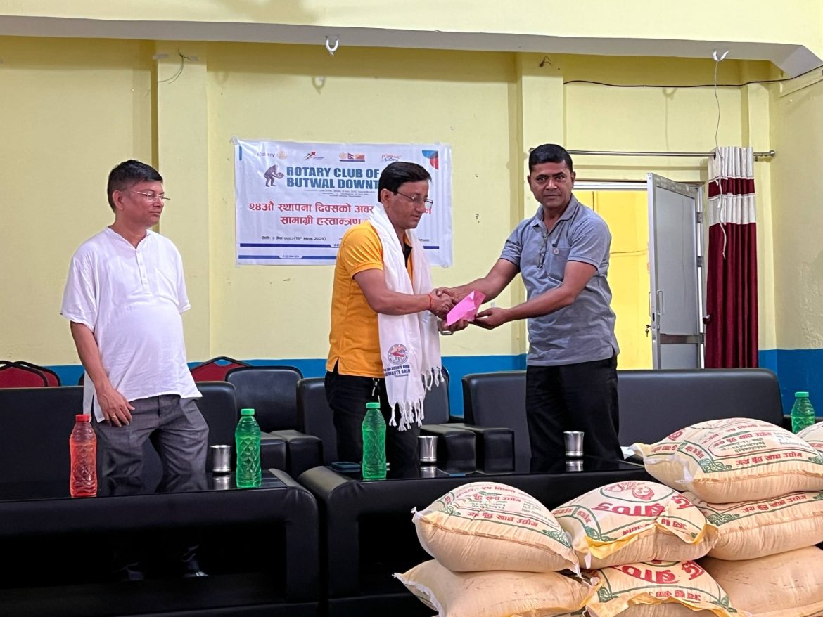 बुटवल।सामाजिक क्षेत्रमा क्रियाशिल रोटरी क्लब अफ बुटवल डाउनटाउनले आफ्नो २४ औ स्थापना दिवसको अवसरमा नेपाल बाल संगठन कपिलबस्तु शाखालाई खाद्यान्न सहयोग गरेको छ । शुक्रबार एक समारोहका बिच क्लबका एजी जिवन अर्याल, अध्यक्ष शिव ज्ञवाली, संस्थापक सदस्य ऋषि बहादुर भण्डारीले नेपाल बाल संगठन कपिलबस्तुका अध्यक्ष गोपाल ज्ञवालीलाई २४ हजार रुपैया बराबरको खाद्यान्न हस्तान्तरण गरेका हुन ।